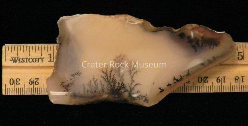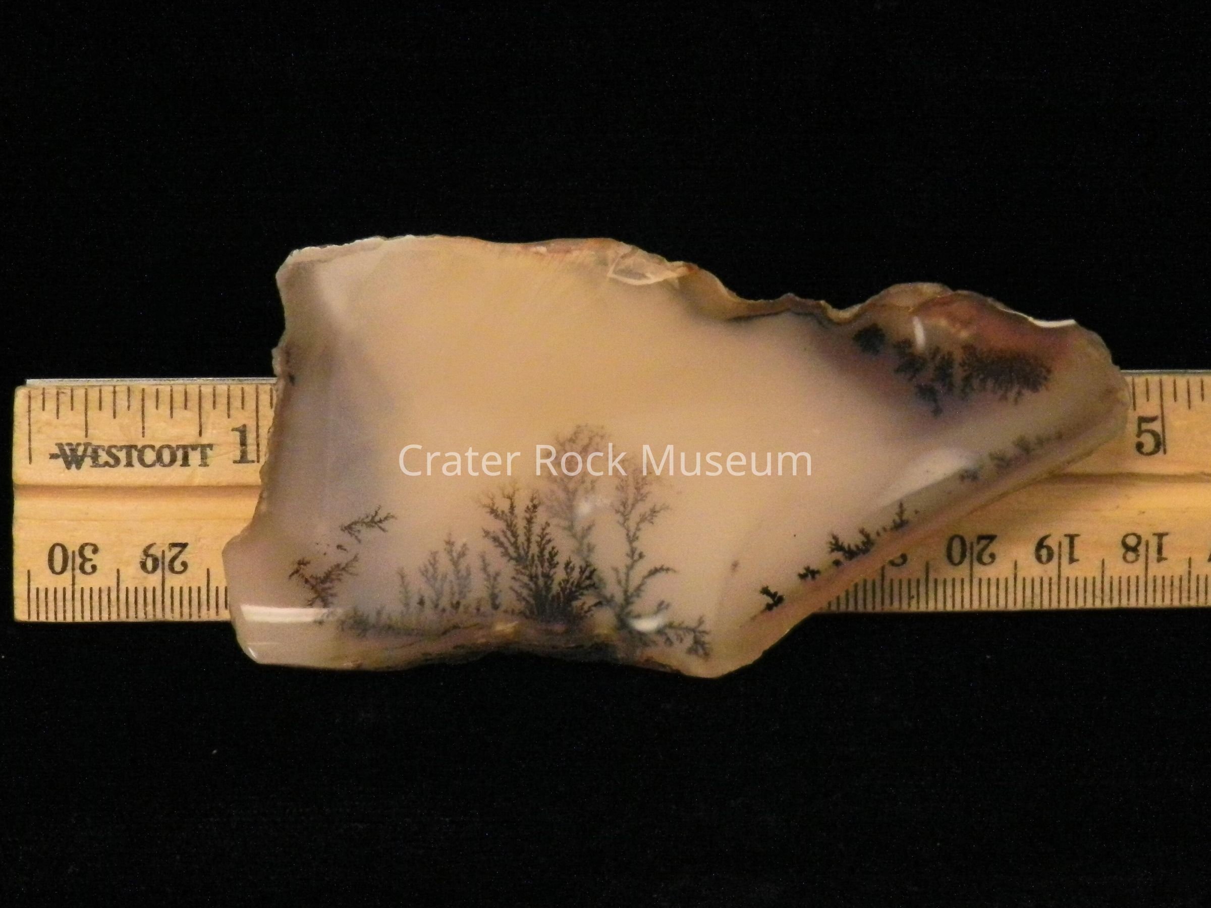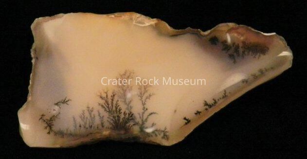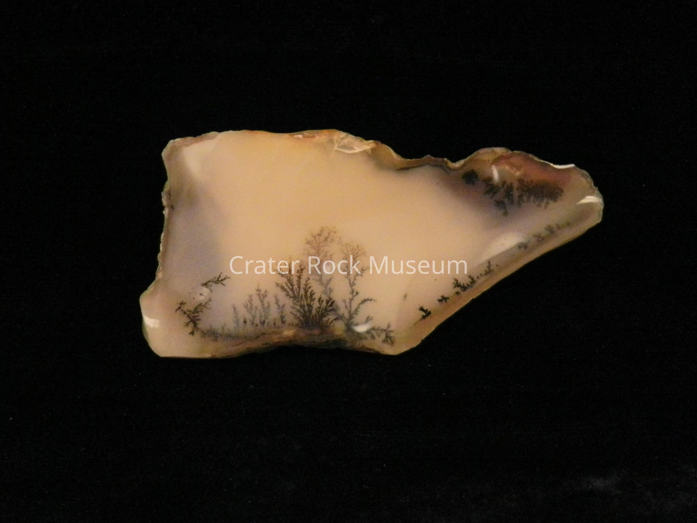 Description: Thin slab with polished face. Translucent creamy beige, tan and brown on outer regions. Light brown, long , multi-branching dendritic structure. One corner is dark brown to black.Collection