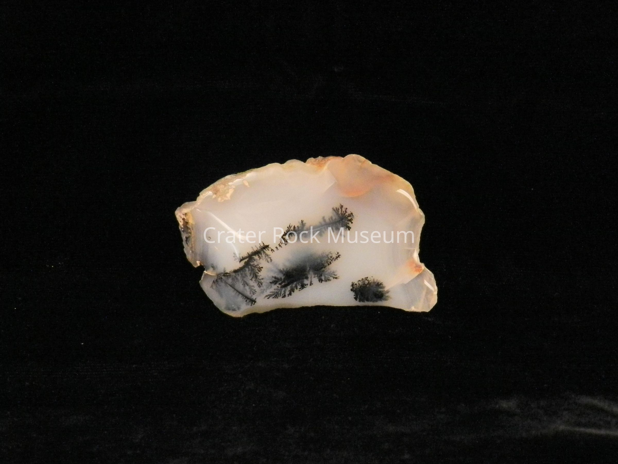 Description: Irregular shape with flat back and polished face. Creamy white and some burnt orange. The dendritic structure is elongated, black with tiny plumes and (1) spot.Collection