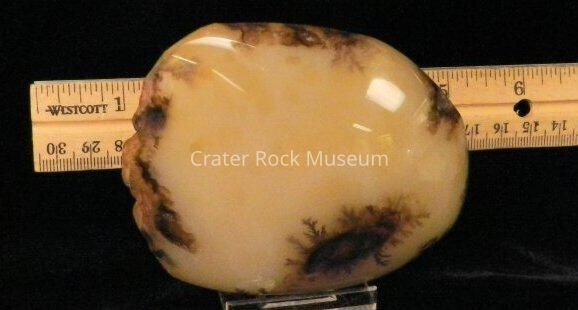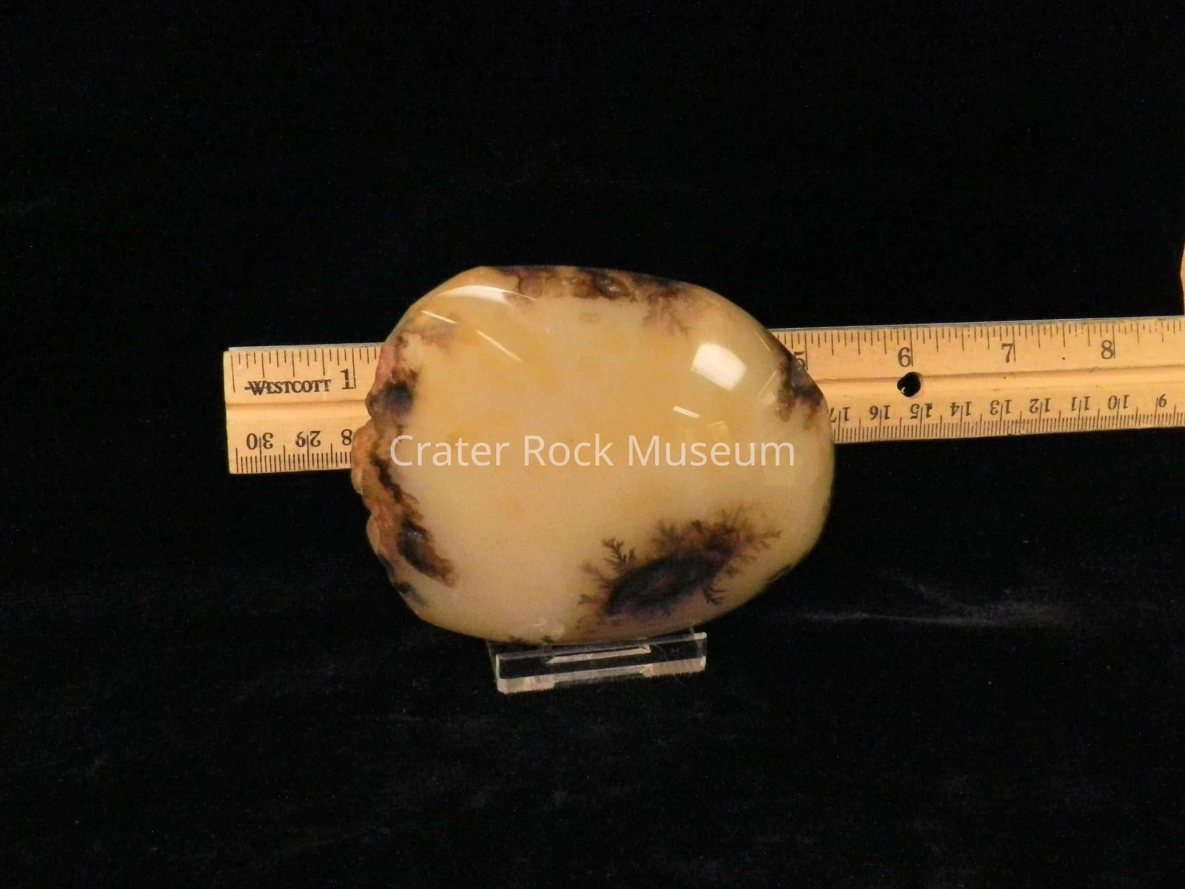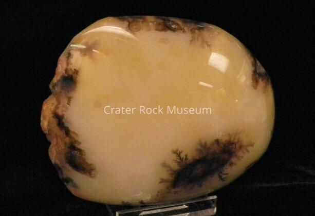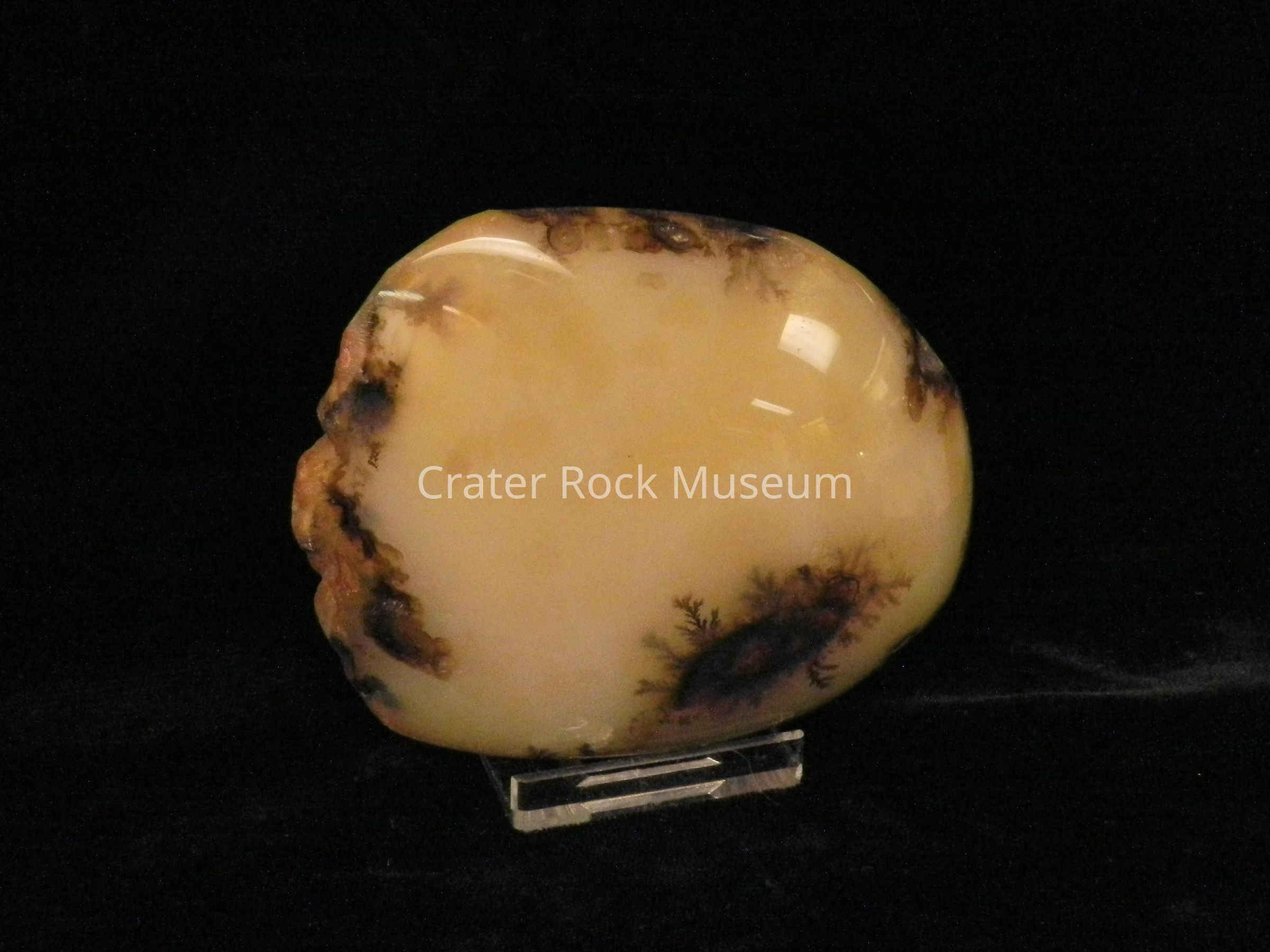 Description: Smooth, rounded back with polished convex face. Translucent creamy tan with darker brown dendritic structures and highlights.Collection