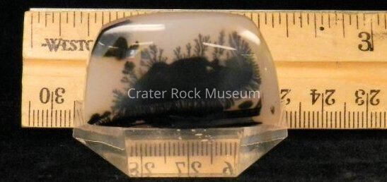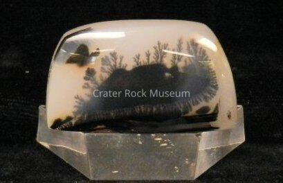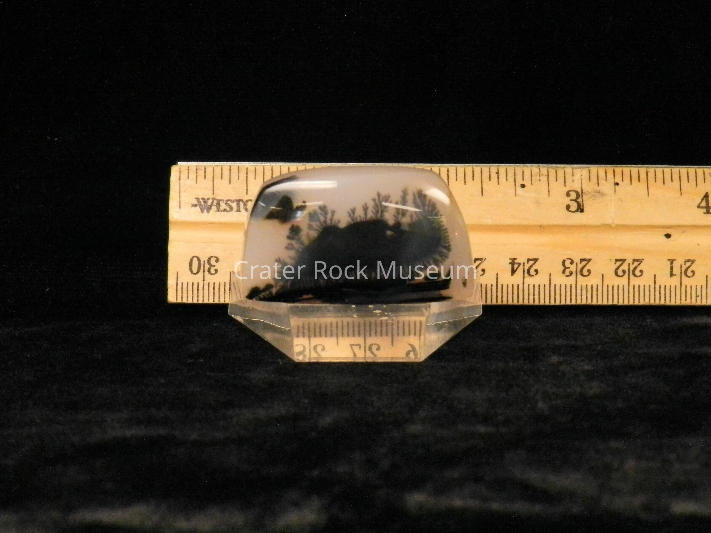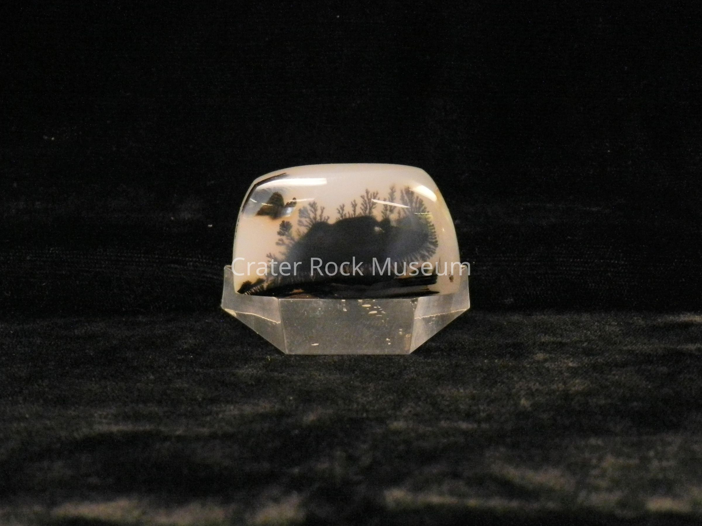 Description: Small, thick slab with convex polished face. Translucent creamy white and tan with large black dendritic structure with fine branches on edges and (1) black spot in one corner.Collection