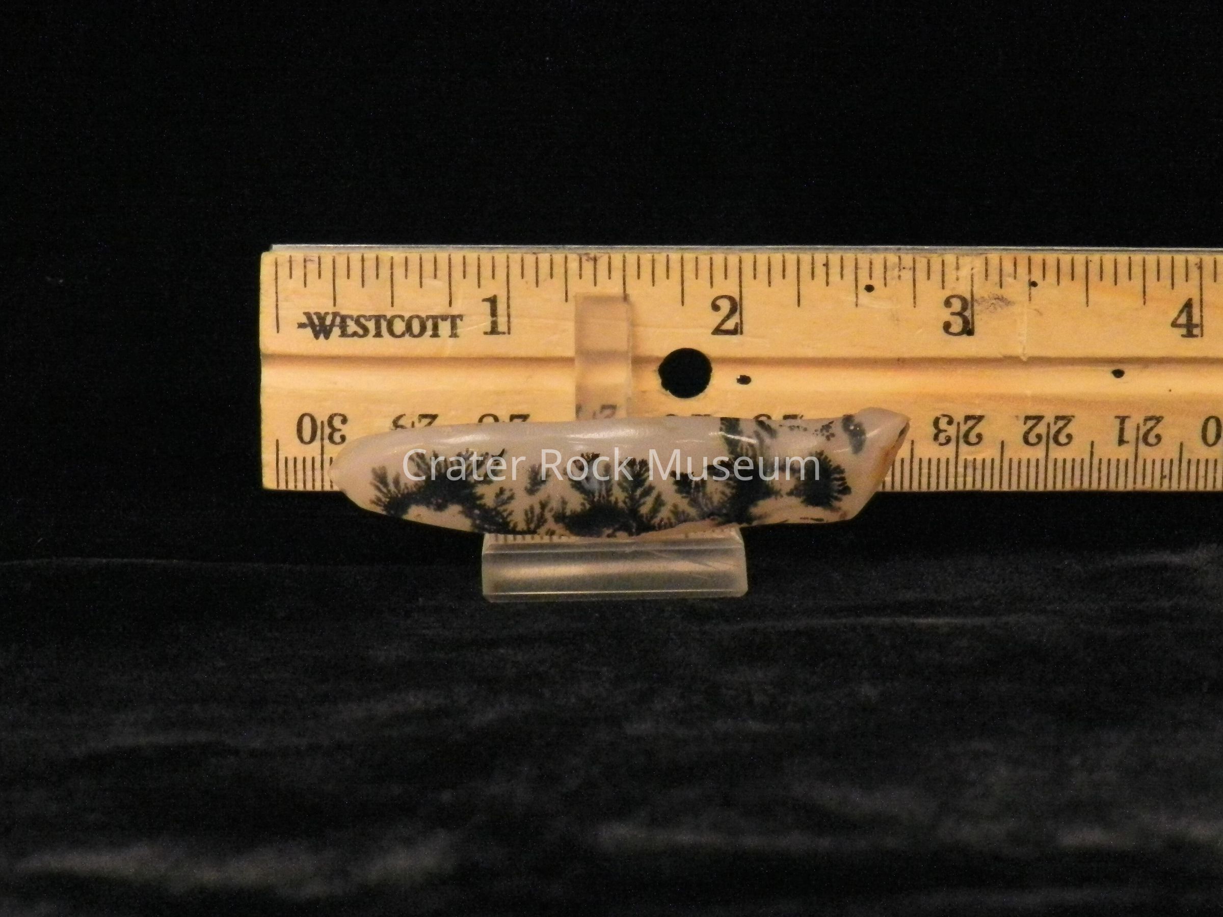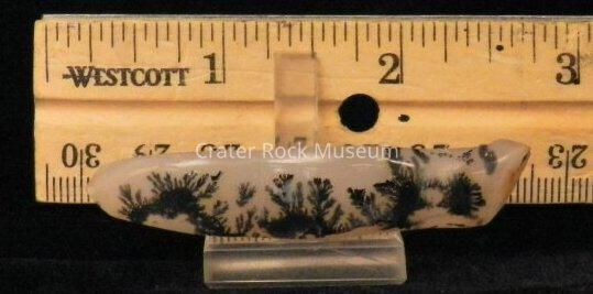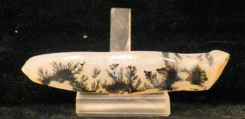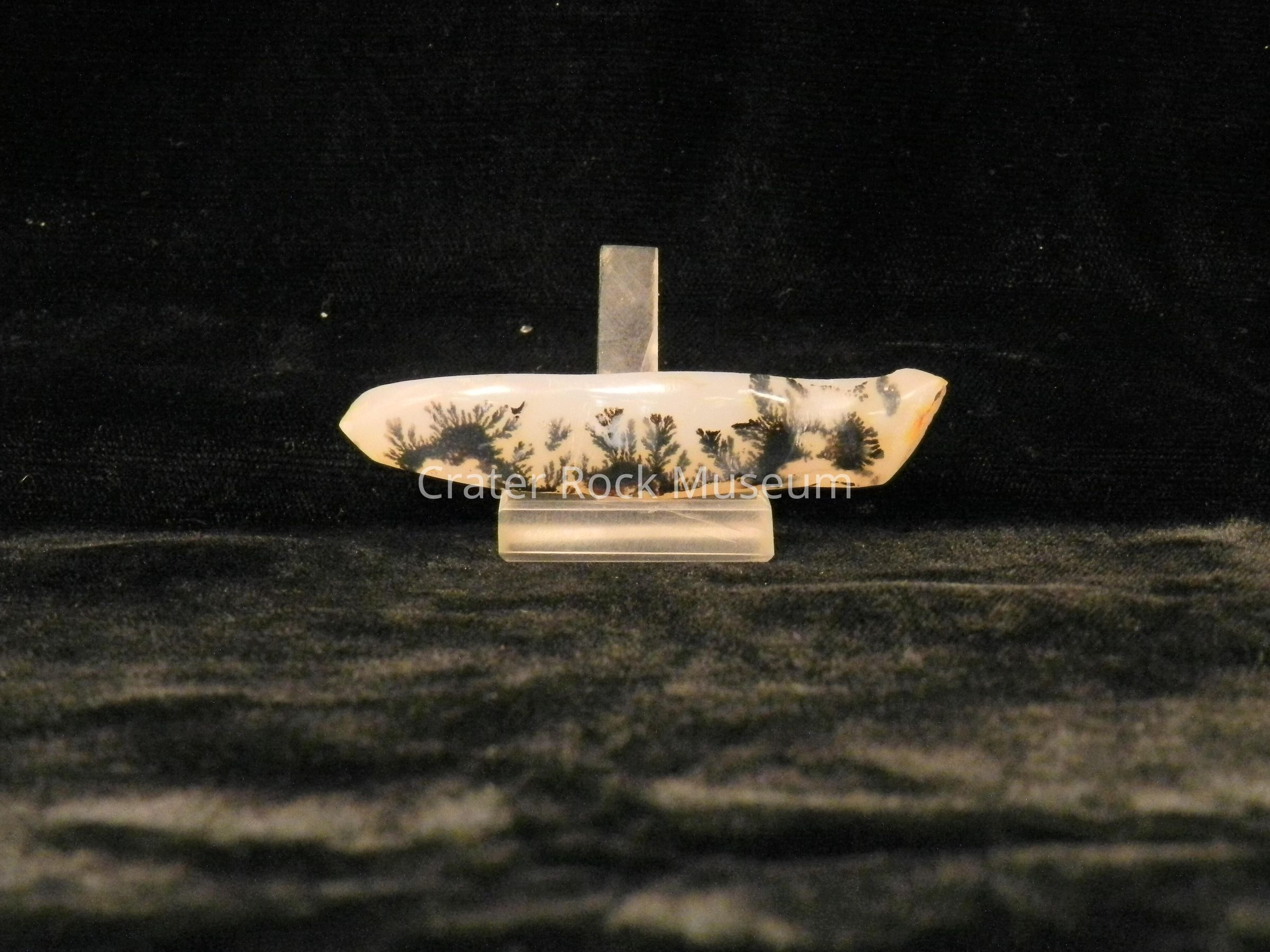 Description: Elongated, wedge shape with (2) flat, un-polished sides and one polished "bumpy"| side. Translucent creamy white with finely branched dendritic structures running along entire face.Collection