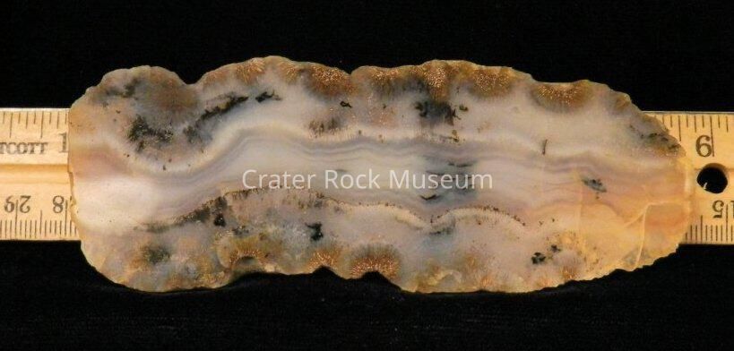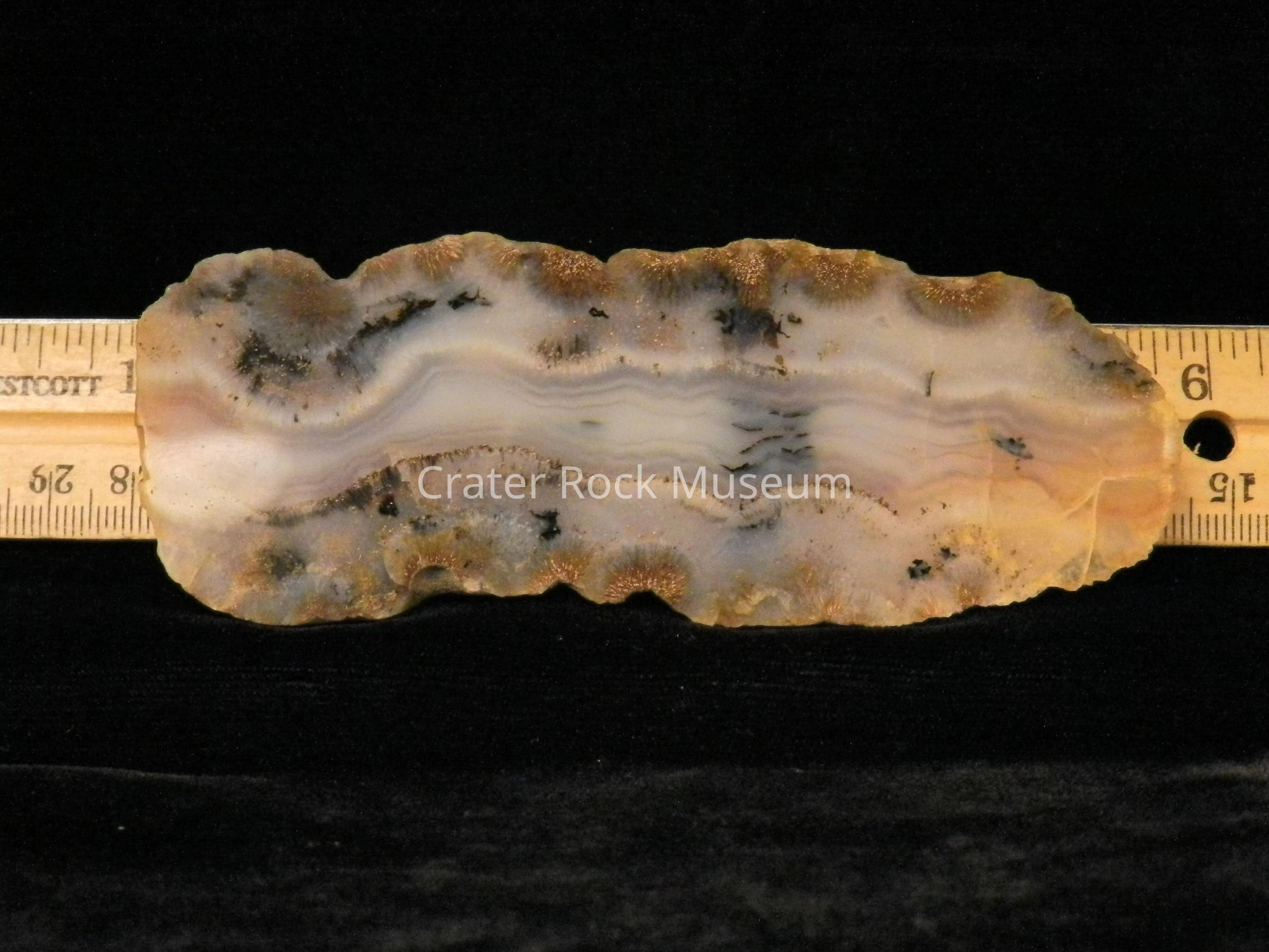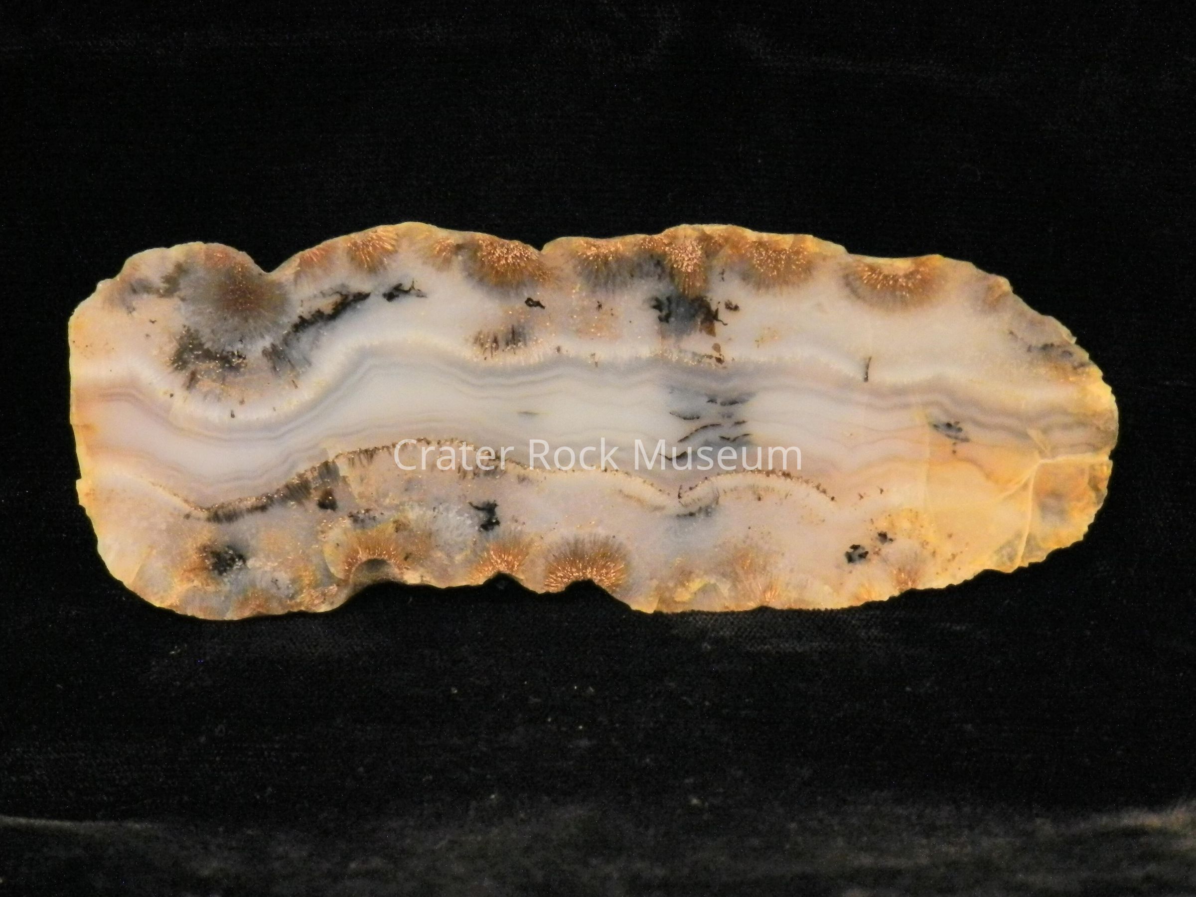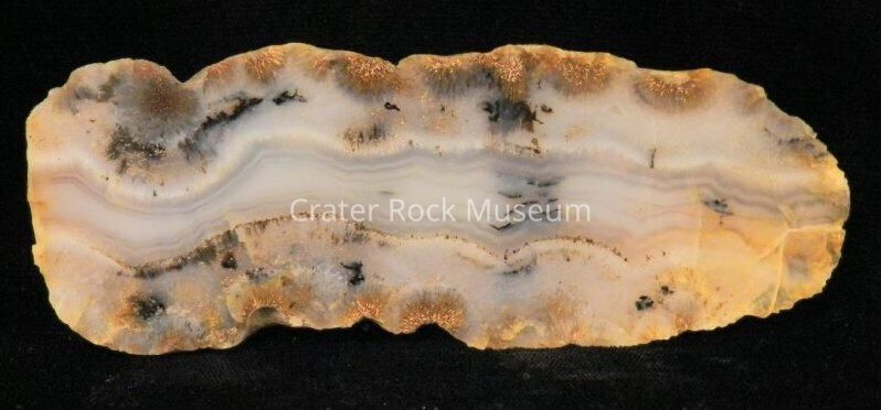 Description: Elongated, rough back with polished face. Translucent creamy whites, tans with banding in center area. Multiple black spots throughout with gold splays primarily on edges.Collection