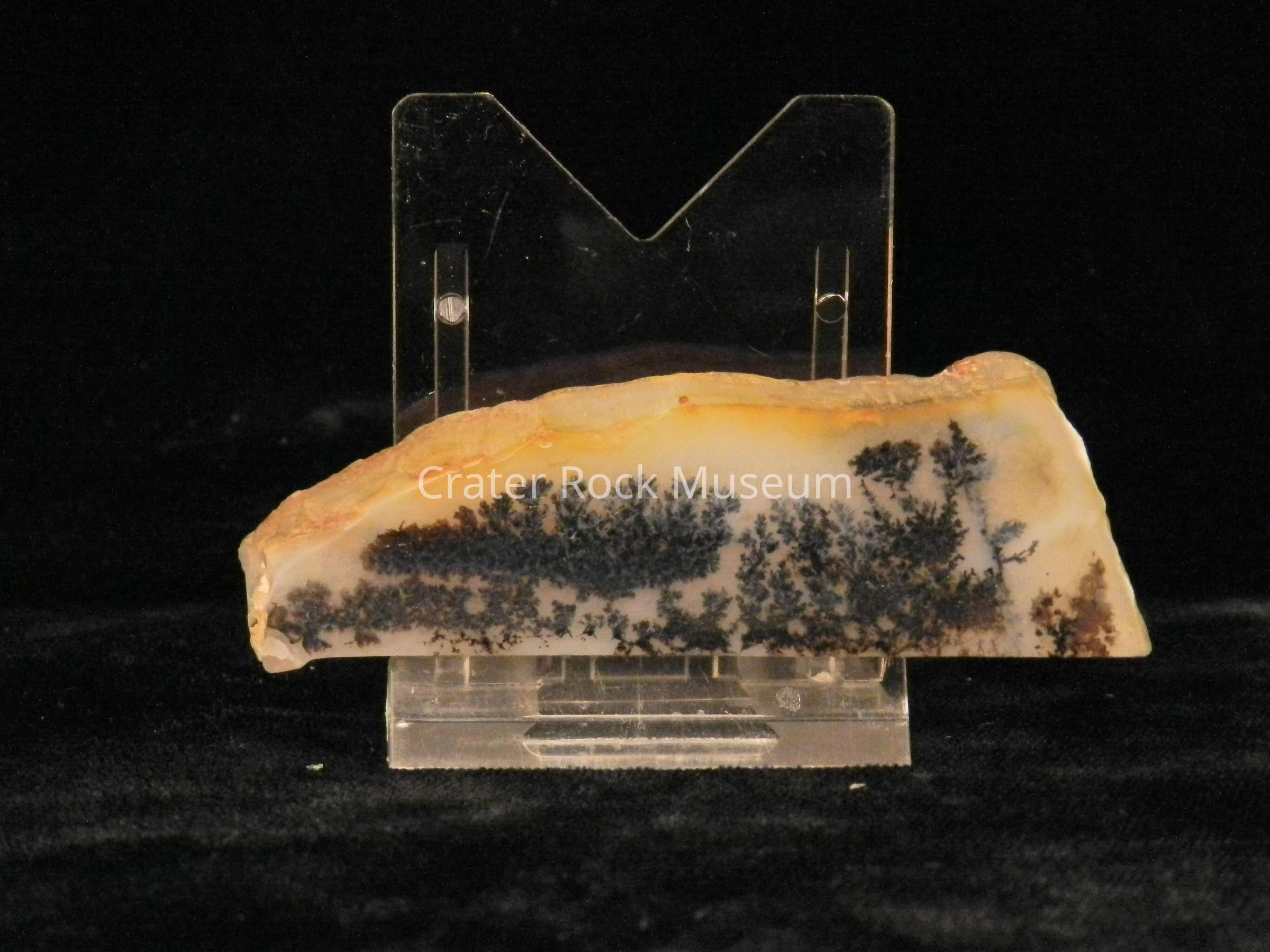 Description: Semi-rounded back with slightly concave polished face. Creamy white inner area with burnt orange highlights on edges. Dendritic structure is multiple small branches covering entire area.Collection