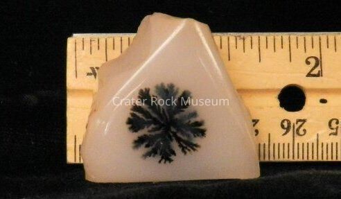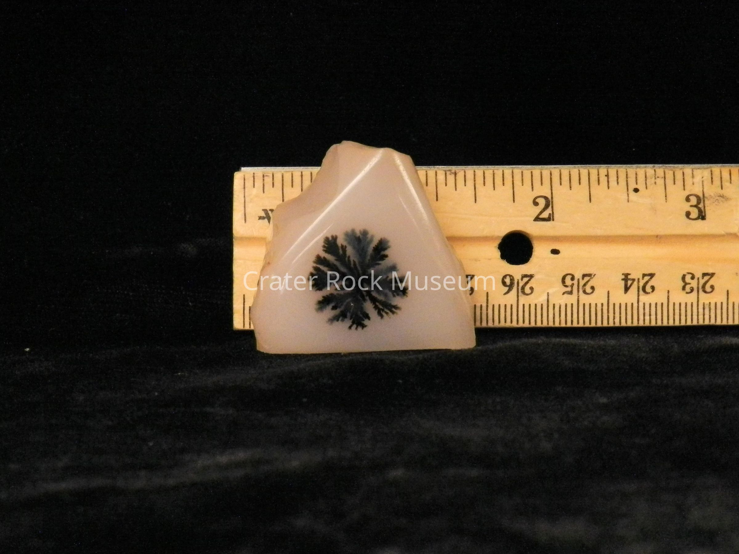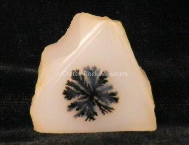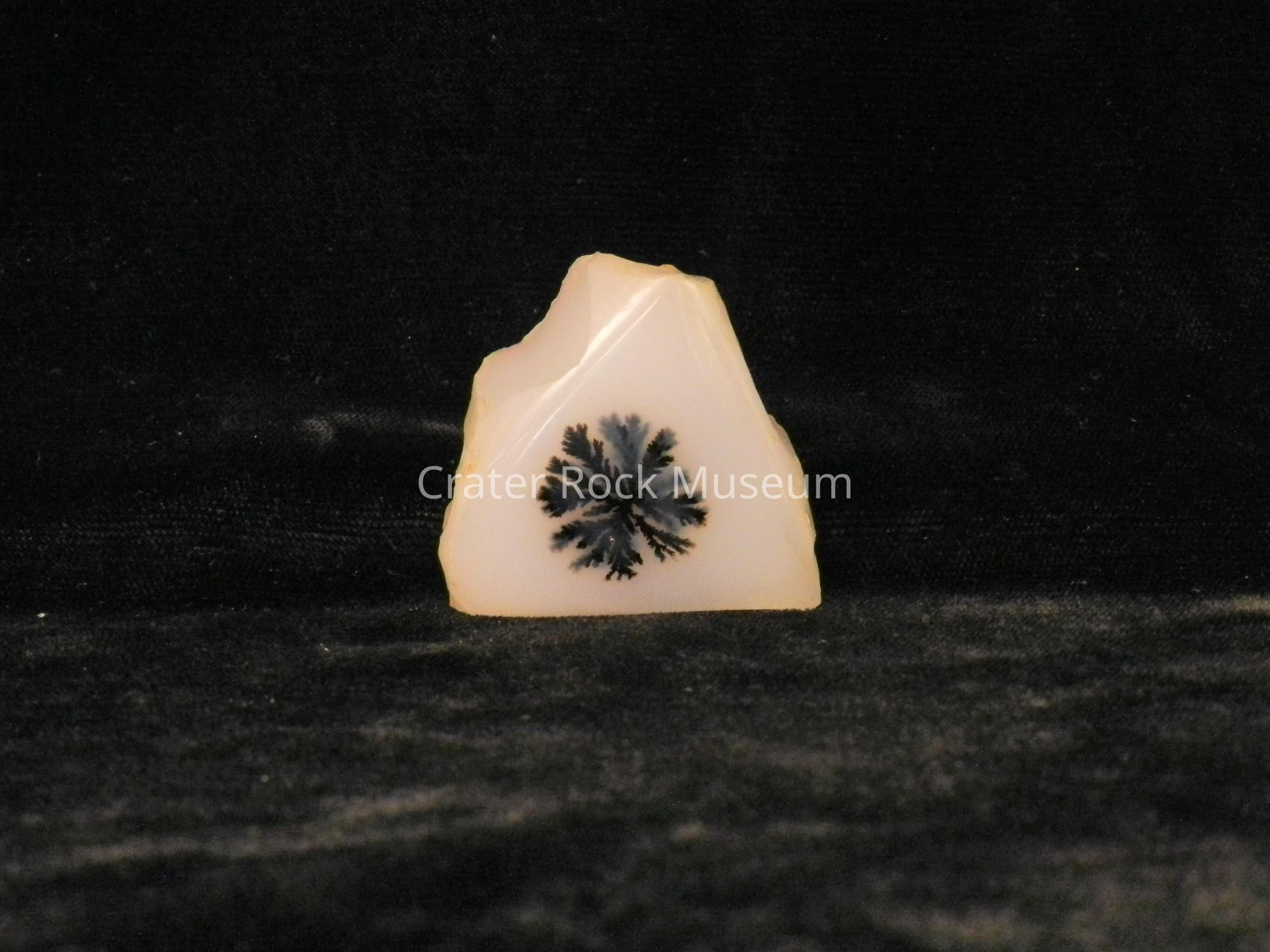 Description: Thick slab with flat, porous back and slightly concave polished face. Translucent creamy white with (1) small circular, multi-branching, black dendritic structure.Collection