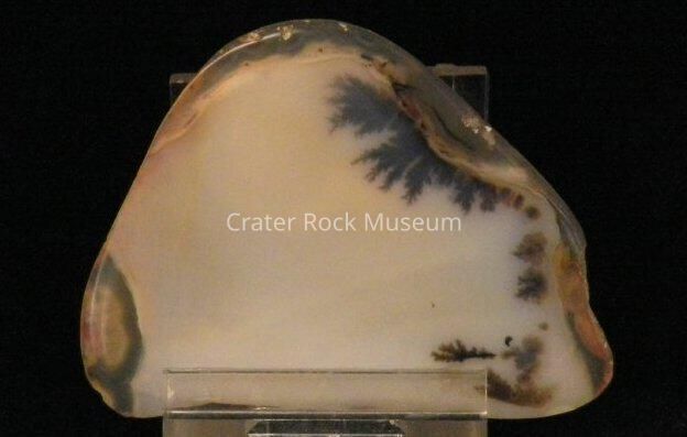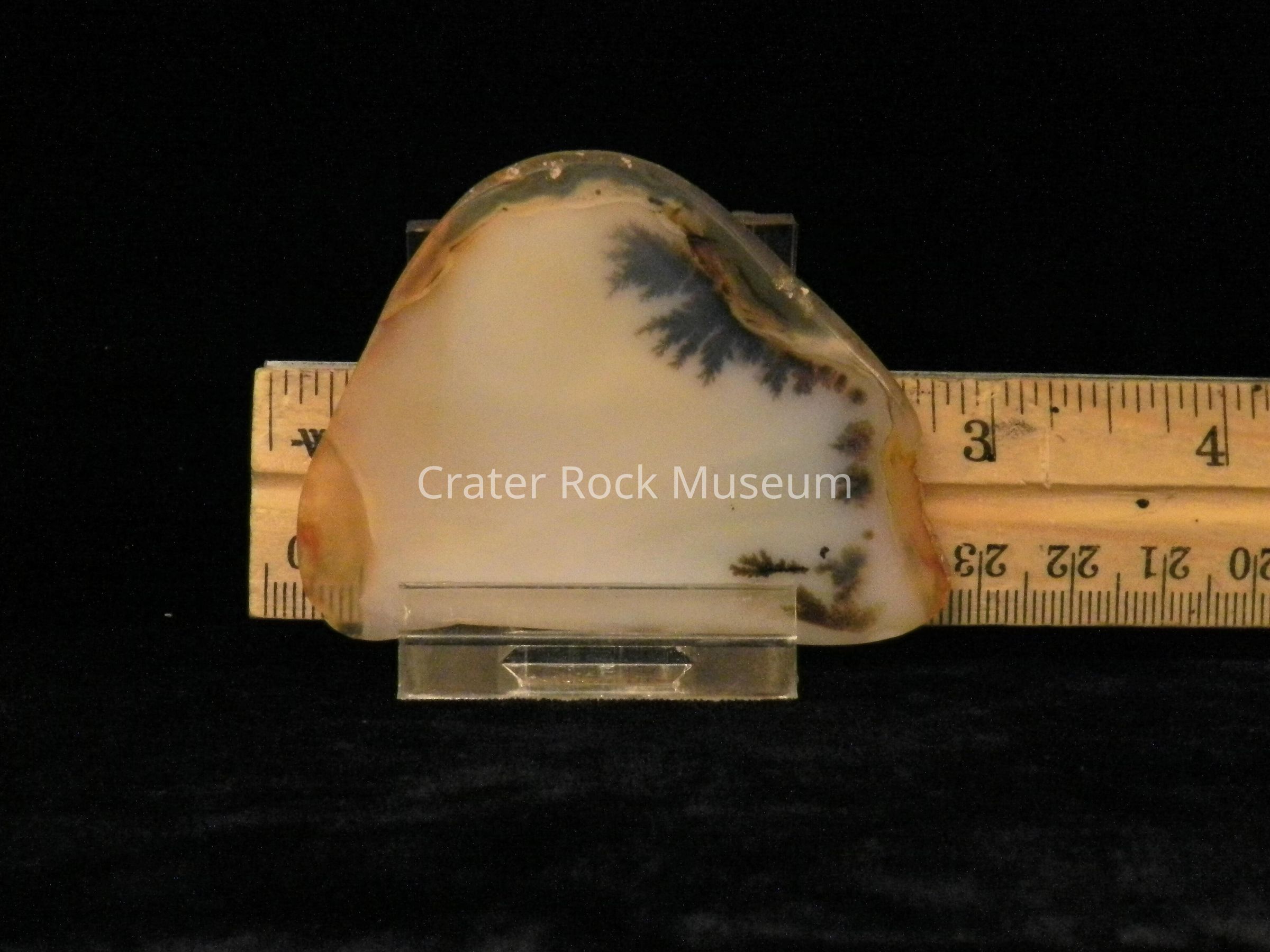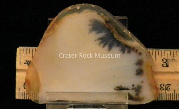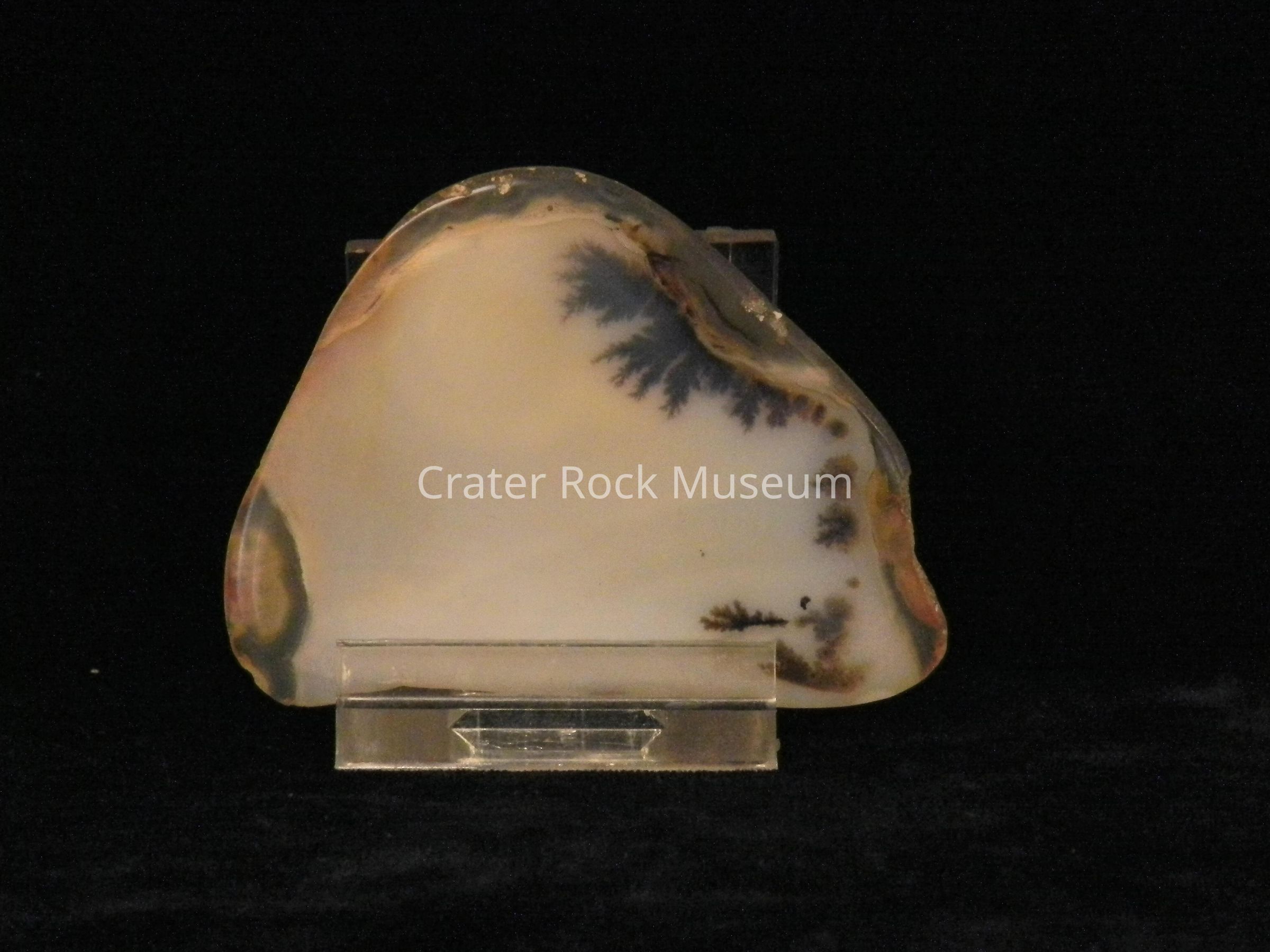 Description: Very thin slice with flat back and polished face. Opaque creamy white and yellow with (1) edge having a translucent brown, multi-branching dendritic structure. (some transparent gold on outer leading edges.Collection