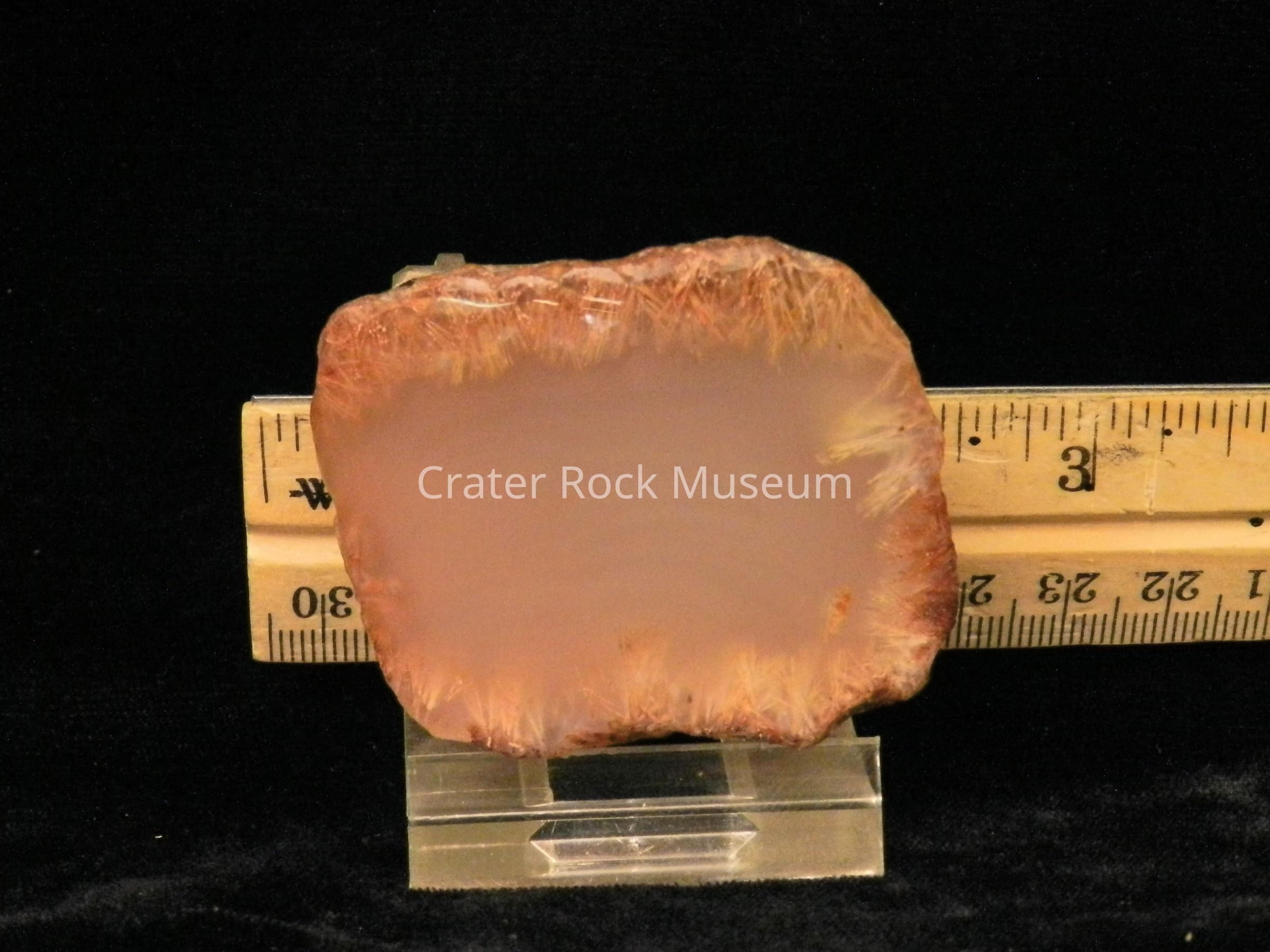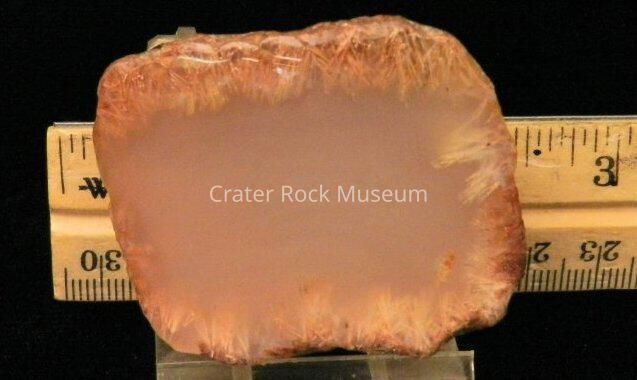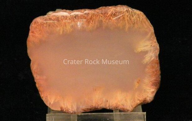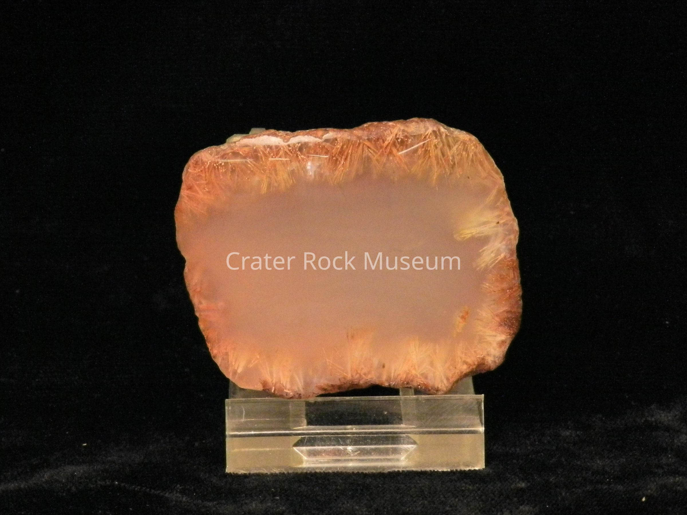 Description: Rough, rounded back with sloping convex polished face. Inner area is translucent creamy pink to gray. Outer edges are beige, tan and gold. Fine "needle-like" splays extending inwards.Collection