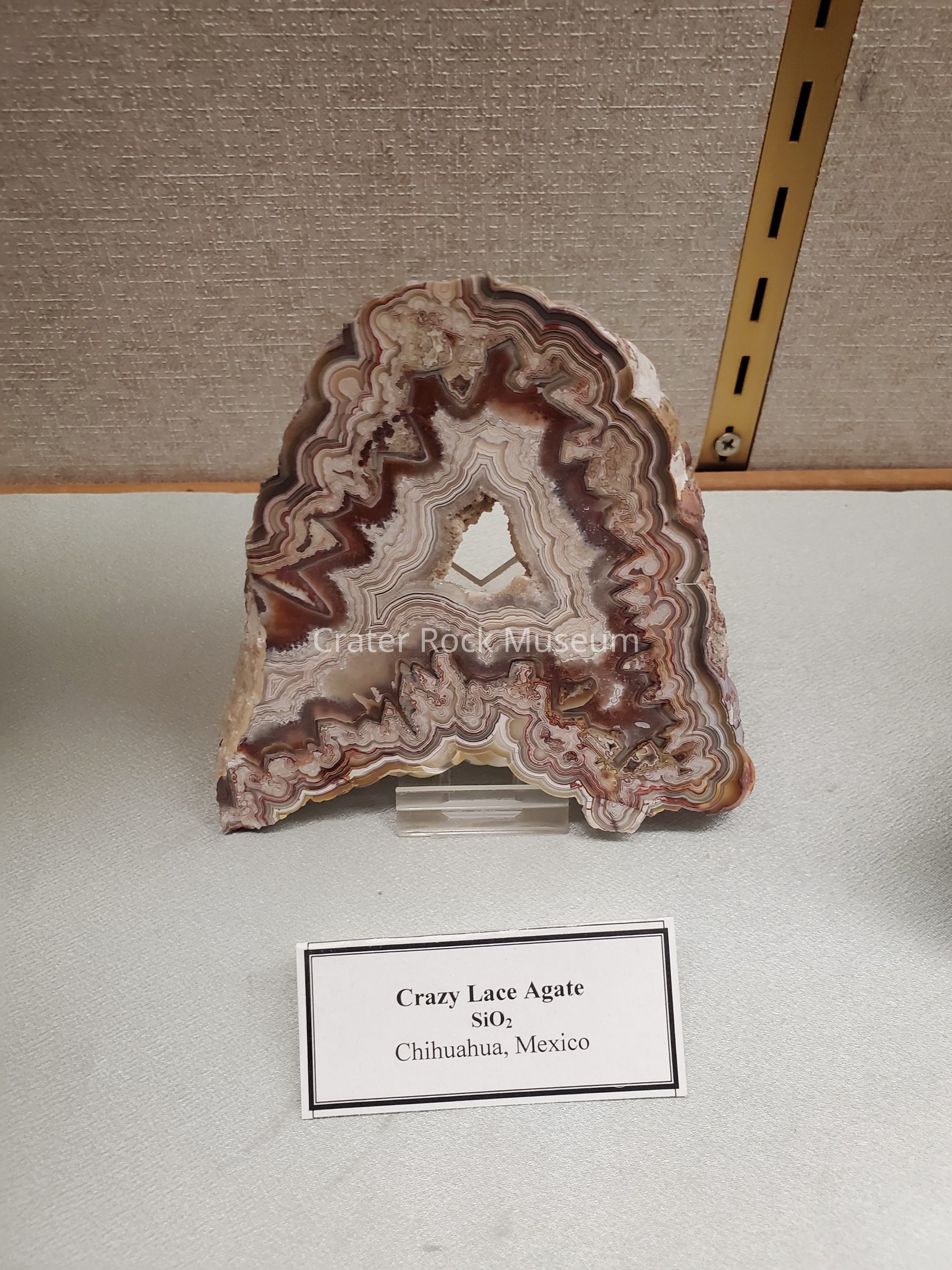 Description: Thick slab (semi-triangular) with polished face. Symmetrical banding with a hole in center. Colors are beige, tan and reddish-brown.