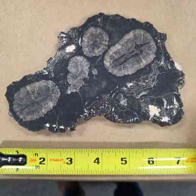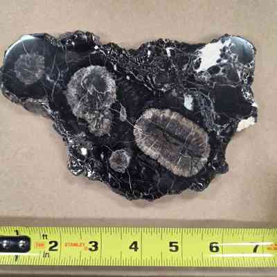 Black slab, polished on one side, with grey-brown blooms and streaks of white throughout. Roughly 1/2" thick
