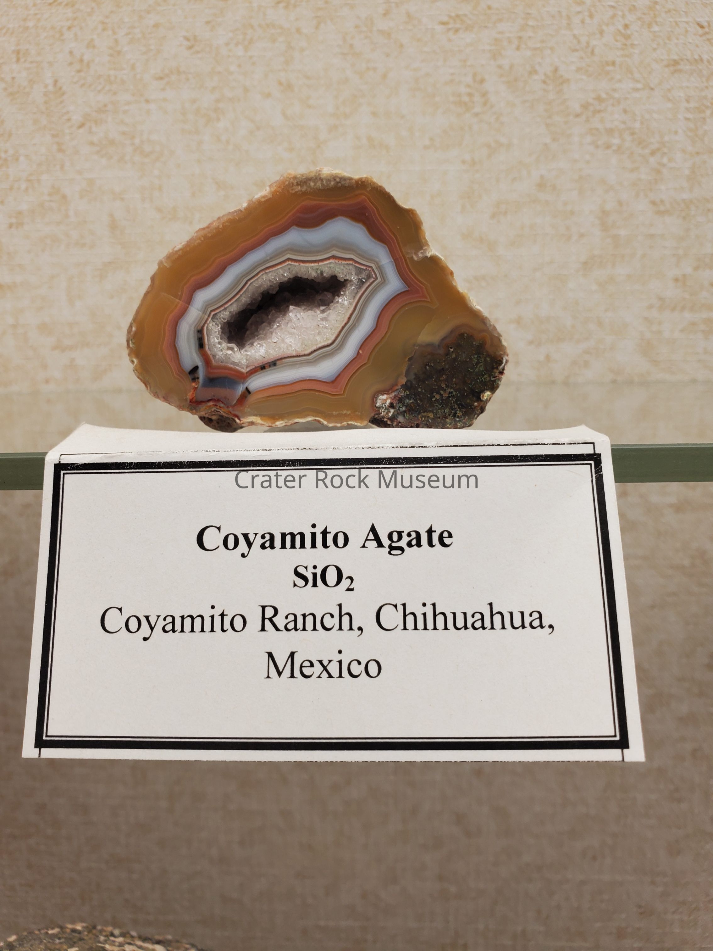 Description: Rough, (semi-porus) rounded back with polished face. (1) creamy yellow band on outer area and dull pink, white and gray bands in center with white crystalline cavity in center.