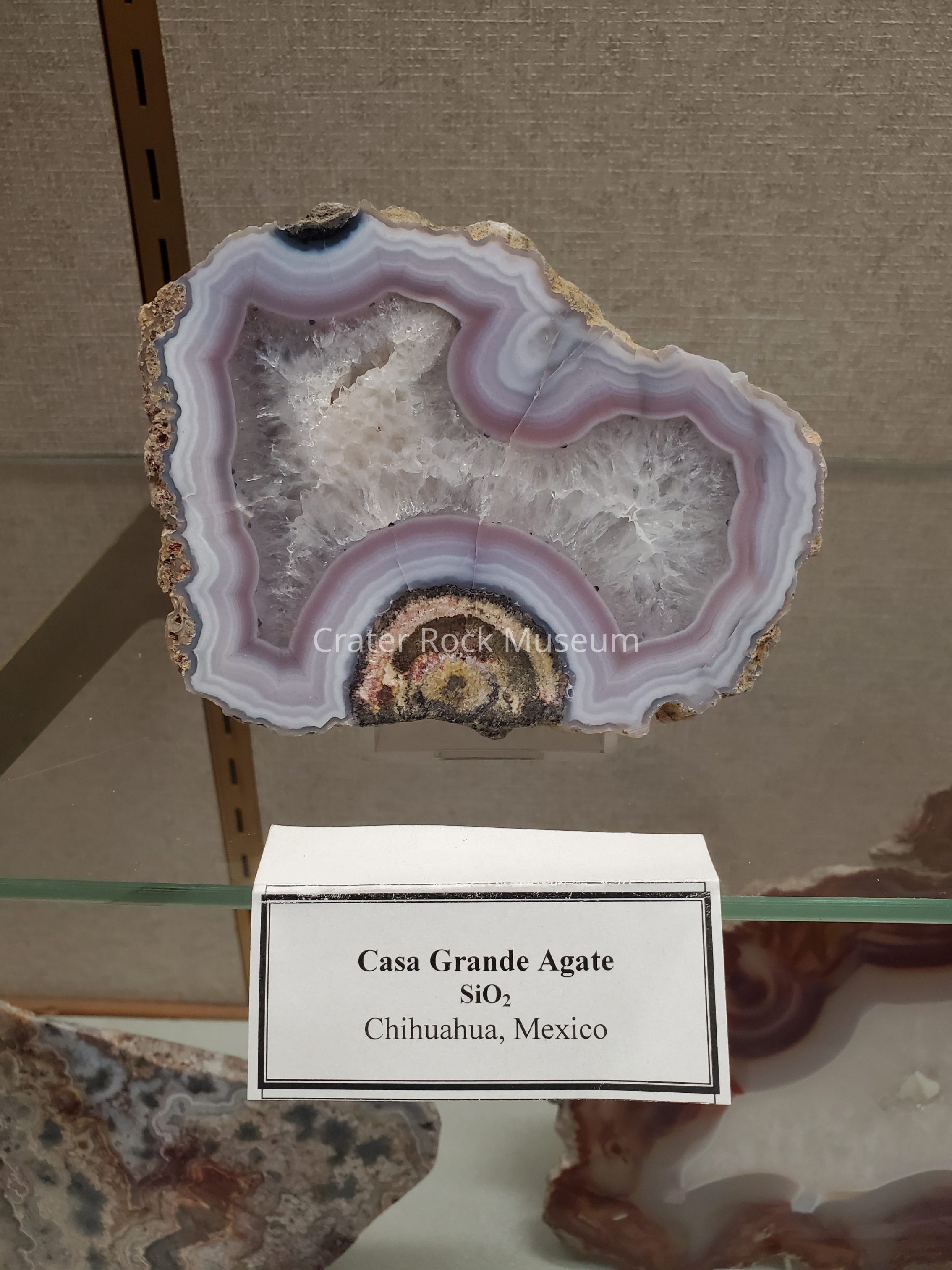 Description: Rough, rounded back with polished face. Creamy white, lavender and purple banding surrounding a transparent white and gray crystalline structure. (1) brown and tan semi-circular band at one edge.