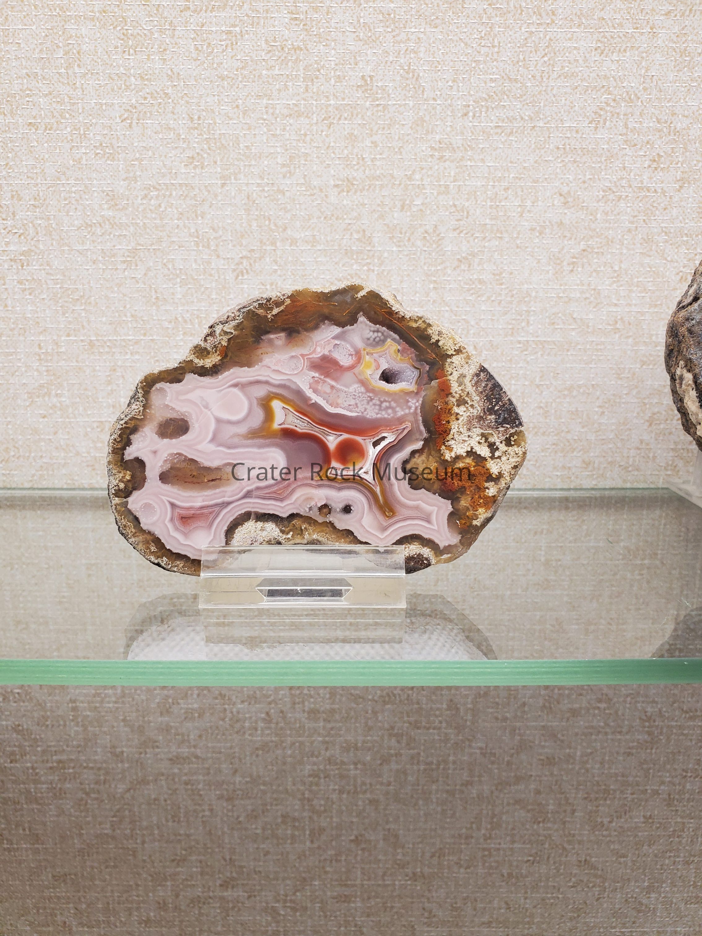 Description: Semi-rough, rounded back with polished face. Outer areas are transparent tan and brown with a dull pink, lavender and a red band in center.