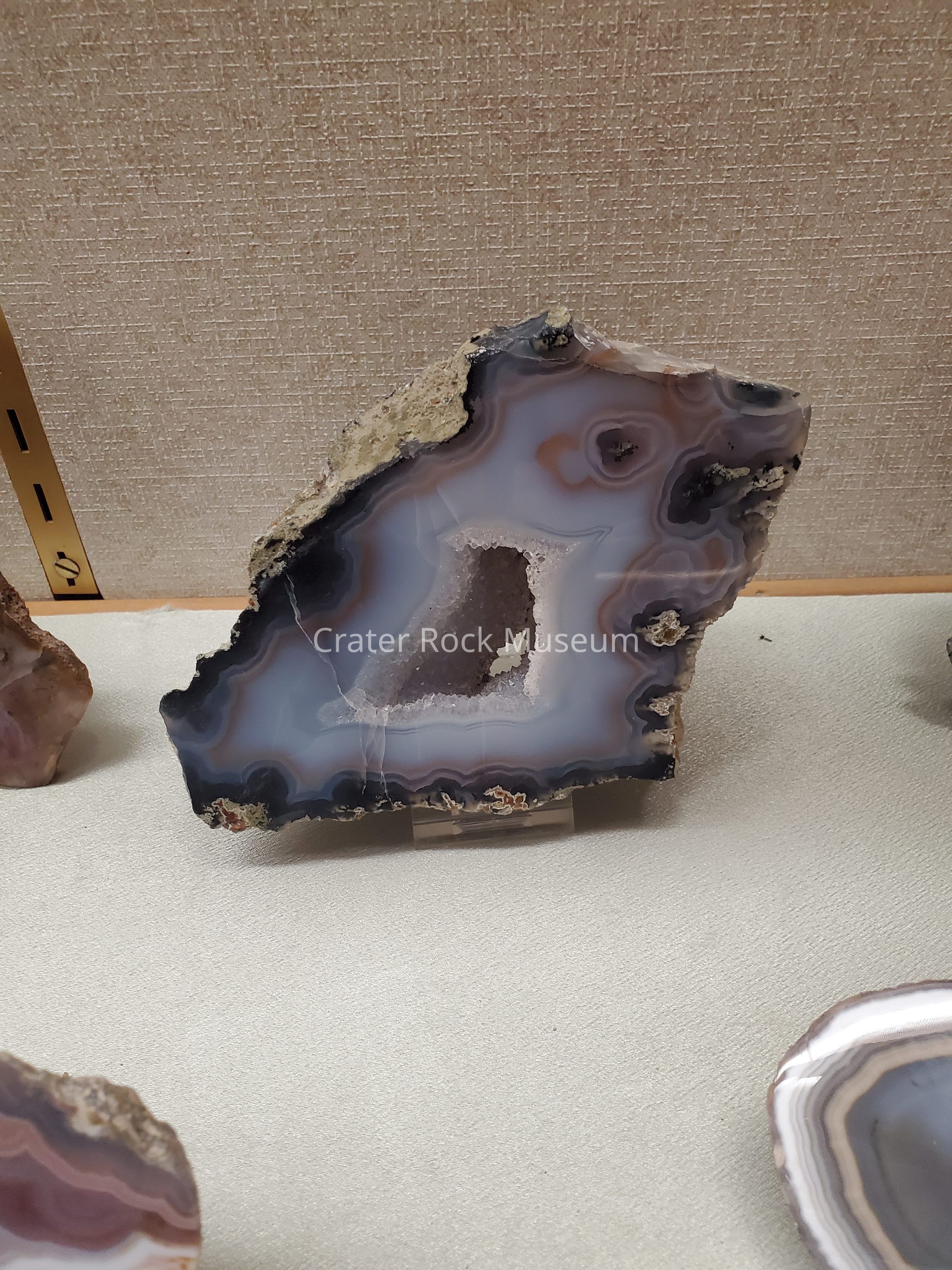 Description: Thick slab with polished face. Outer band is dark gray to black, mostly transparent with a light brown band surrounding a translucent blue-gray and creamy white, with a crystalline structure in a hollow cavity.