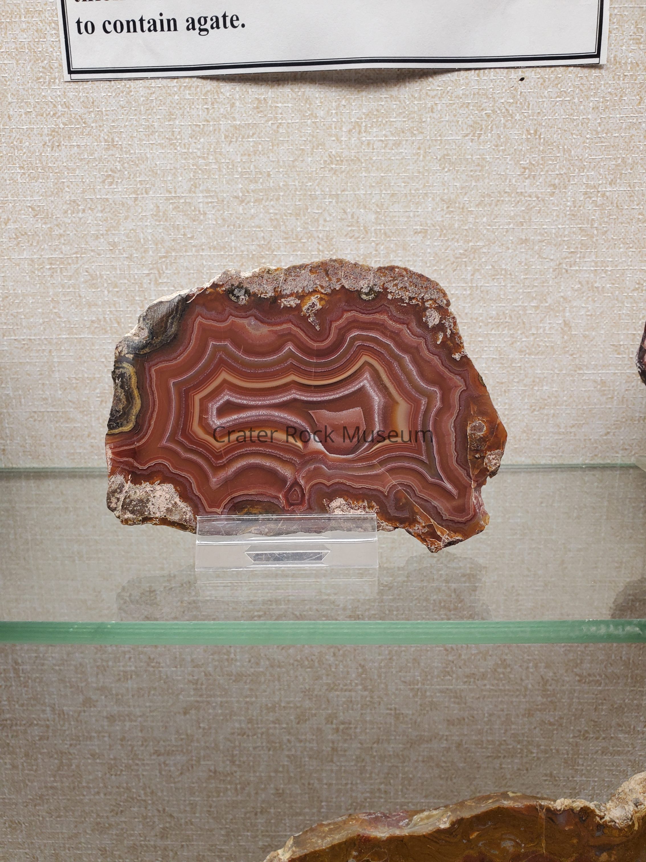 Description: Thin slice with polished face. Highly distinct banding of reddish-browns and tans with one area of black on one outer edge.