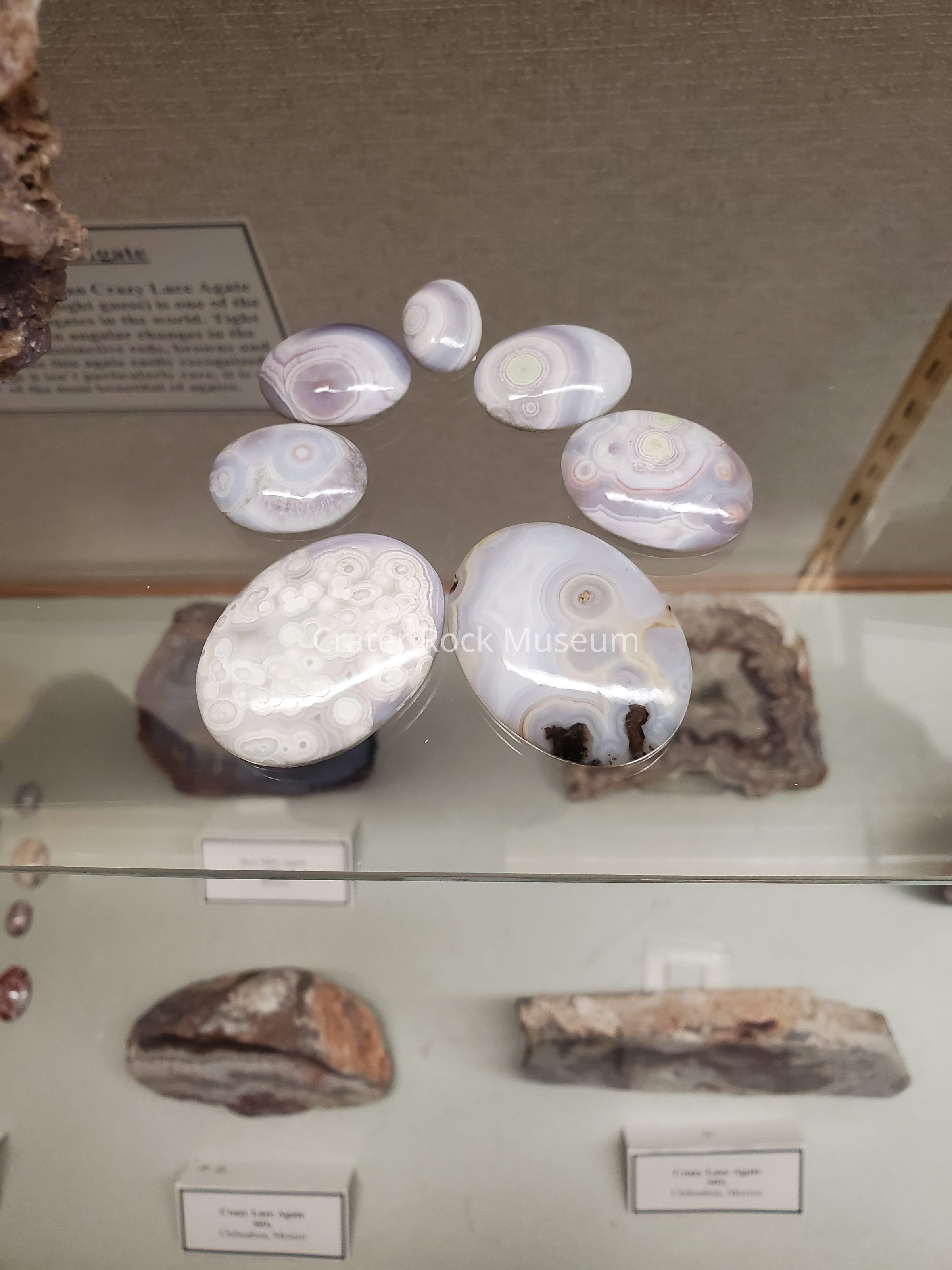 Description: Various sized ovals with convex polished faces. Colors are generally lavender to white with orbicular structures.