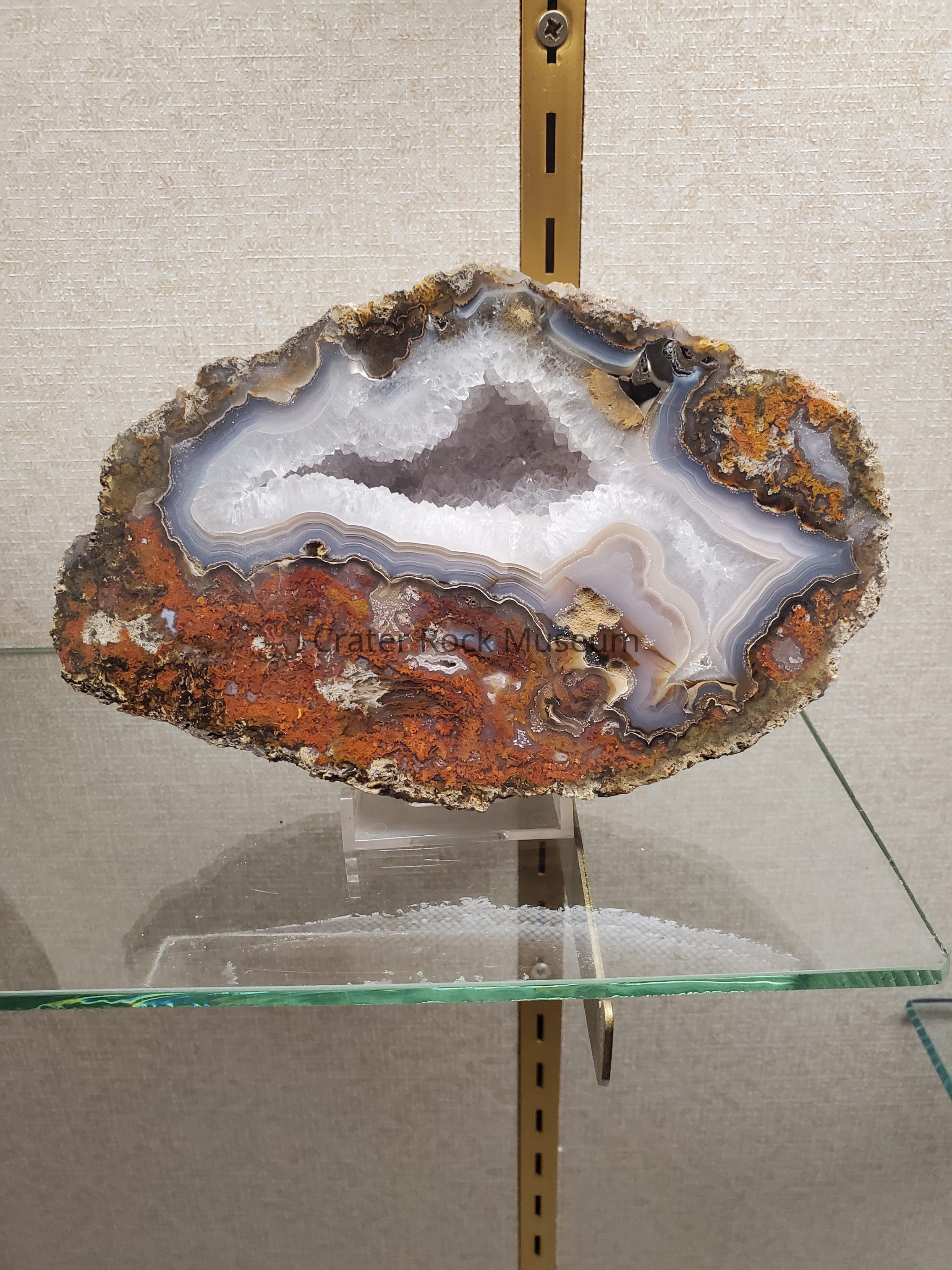 Description: Large, rough, rounded back with polished face. Outer areas are a mix of transparent burnt orange, black, blue-gray, tan and some dark green. The inner area is a banded blue-gray, tan and some green with a white crystalline hollow cavity in center.