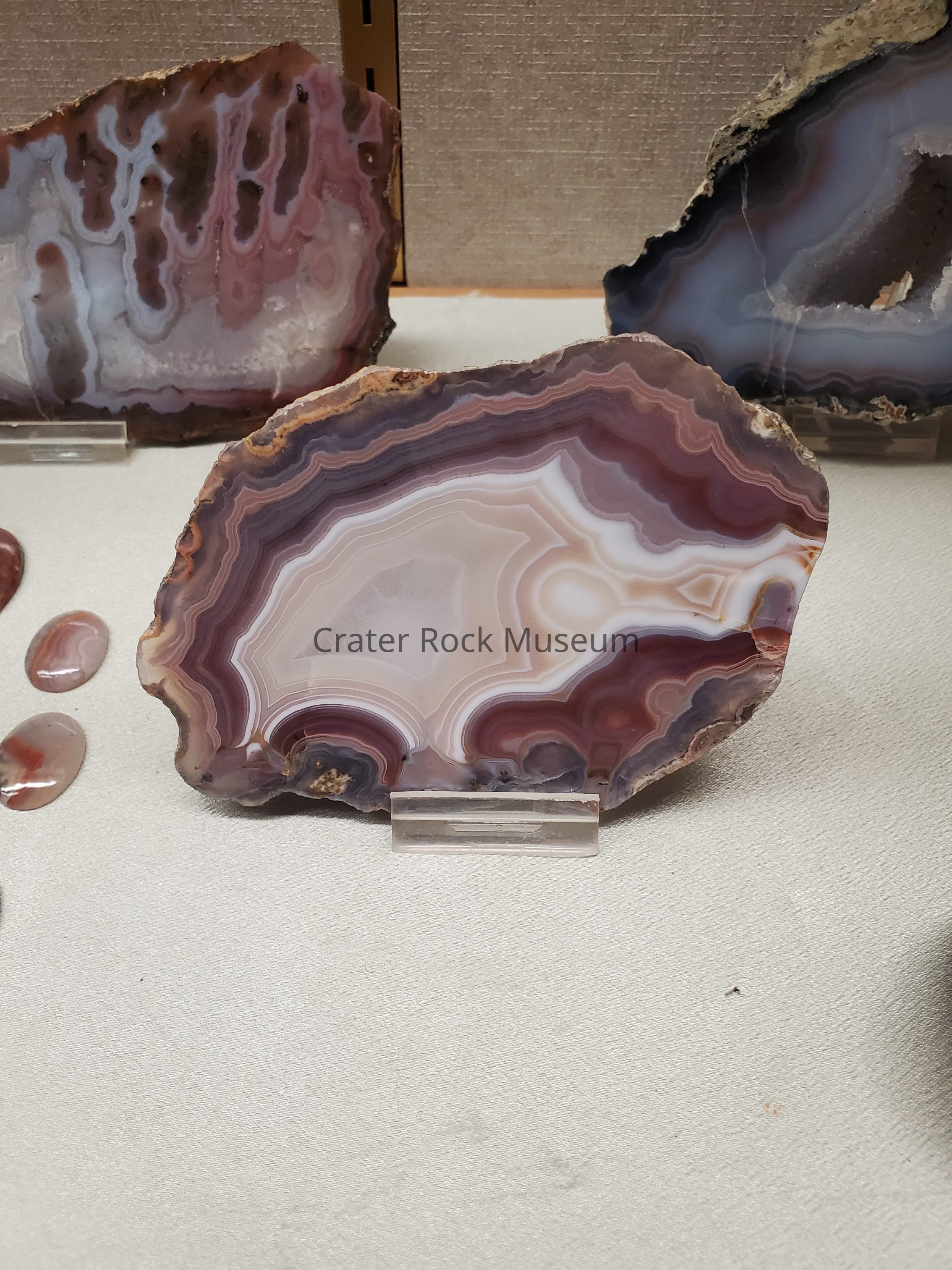 Description: Rough, wedged cut with (2) polished sides. (one partial). Outer area is banded blue-gray and dull pink with white and tan banding in center.