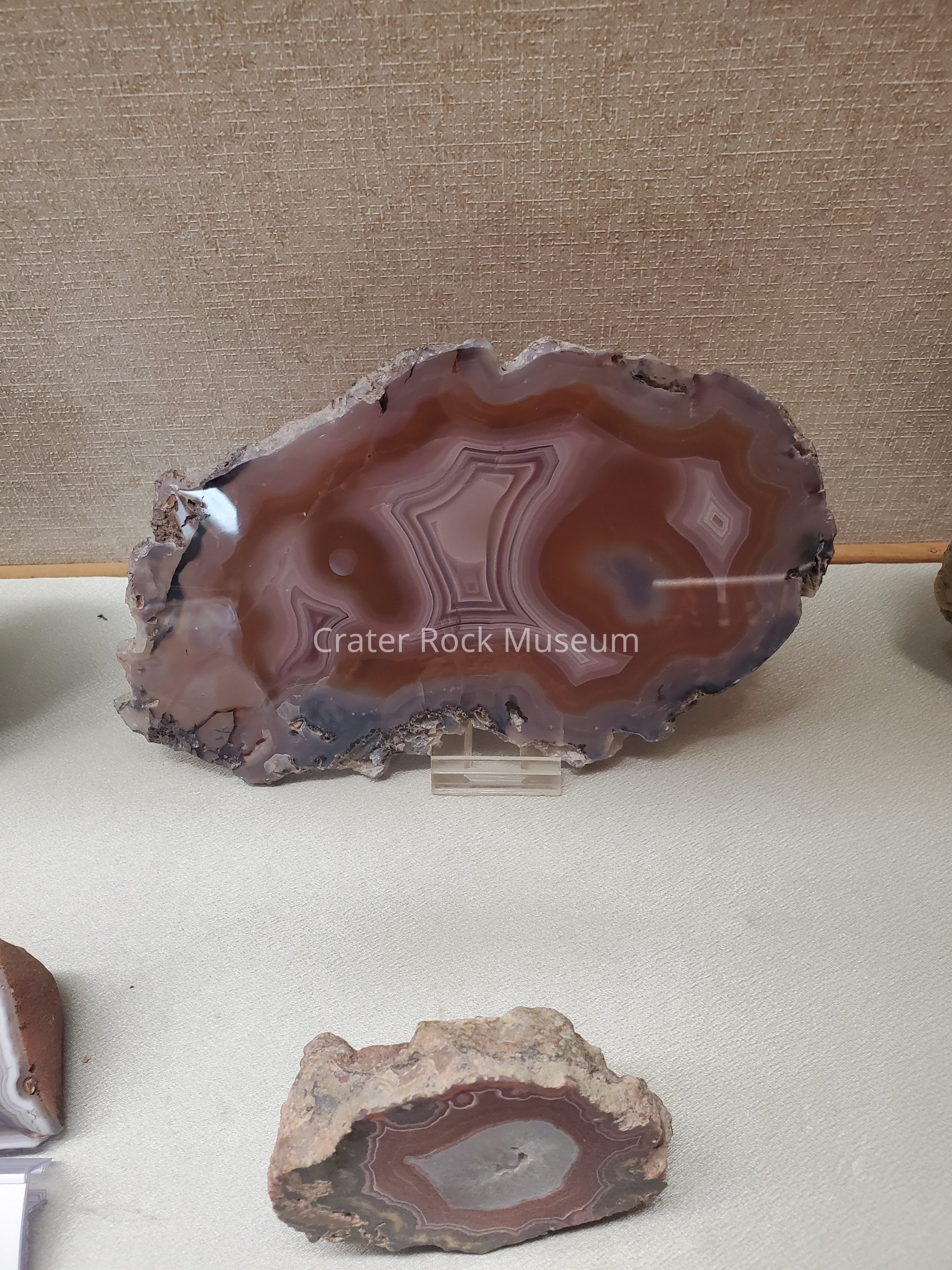 Description: Thin slice with polished face. Translucent blue-gray and brown to pink and lavender banding. Some fracturing is visible.