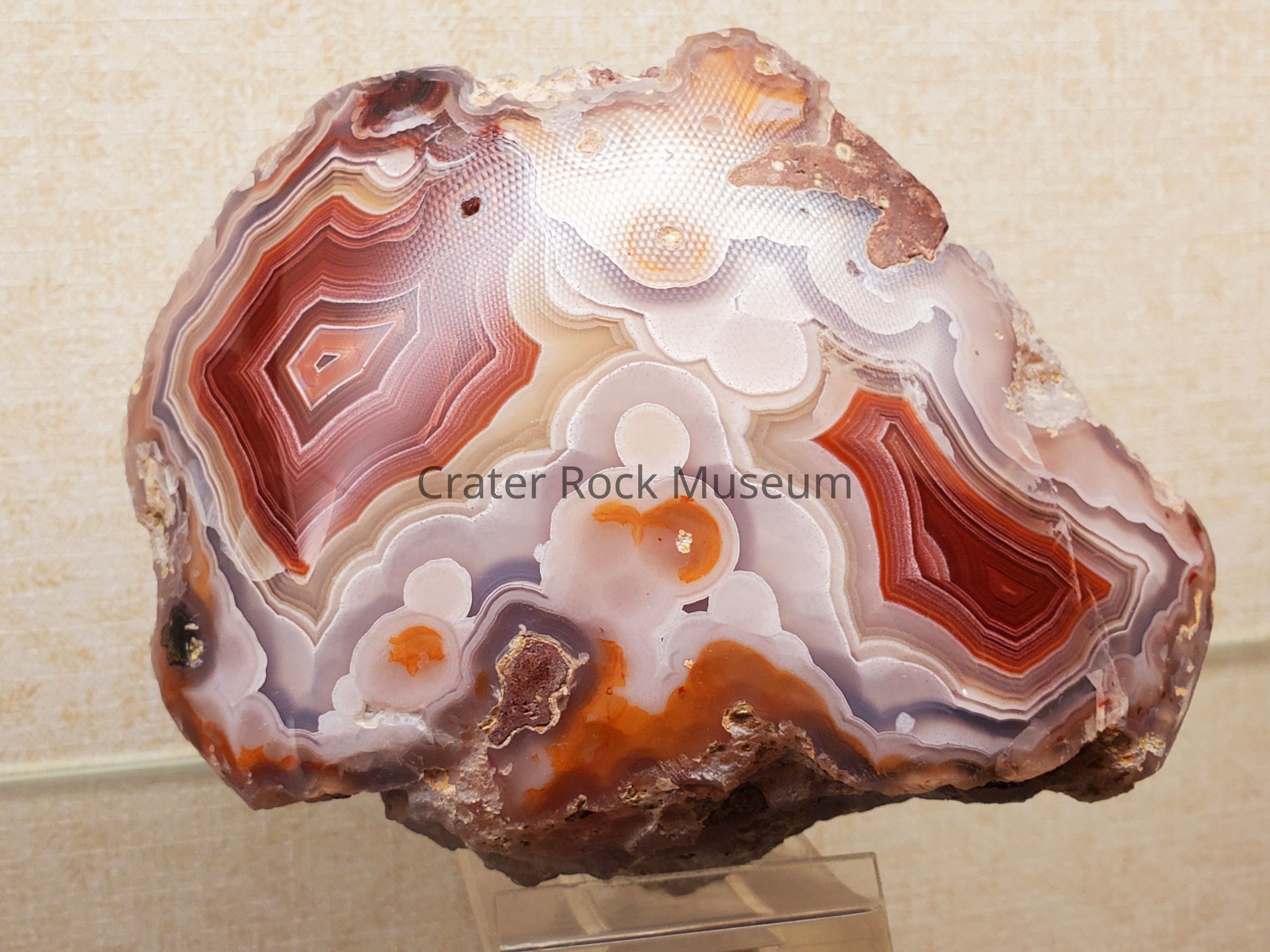 Description: Rough, rounded back with convex polished face. Large mixture of bands and orbs throughout. Color is gray creamy white, gold, red, blue-gray and slight green, all banded.