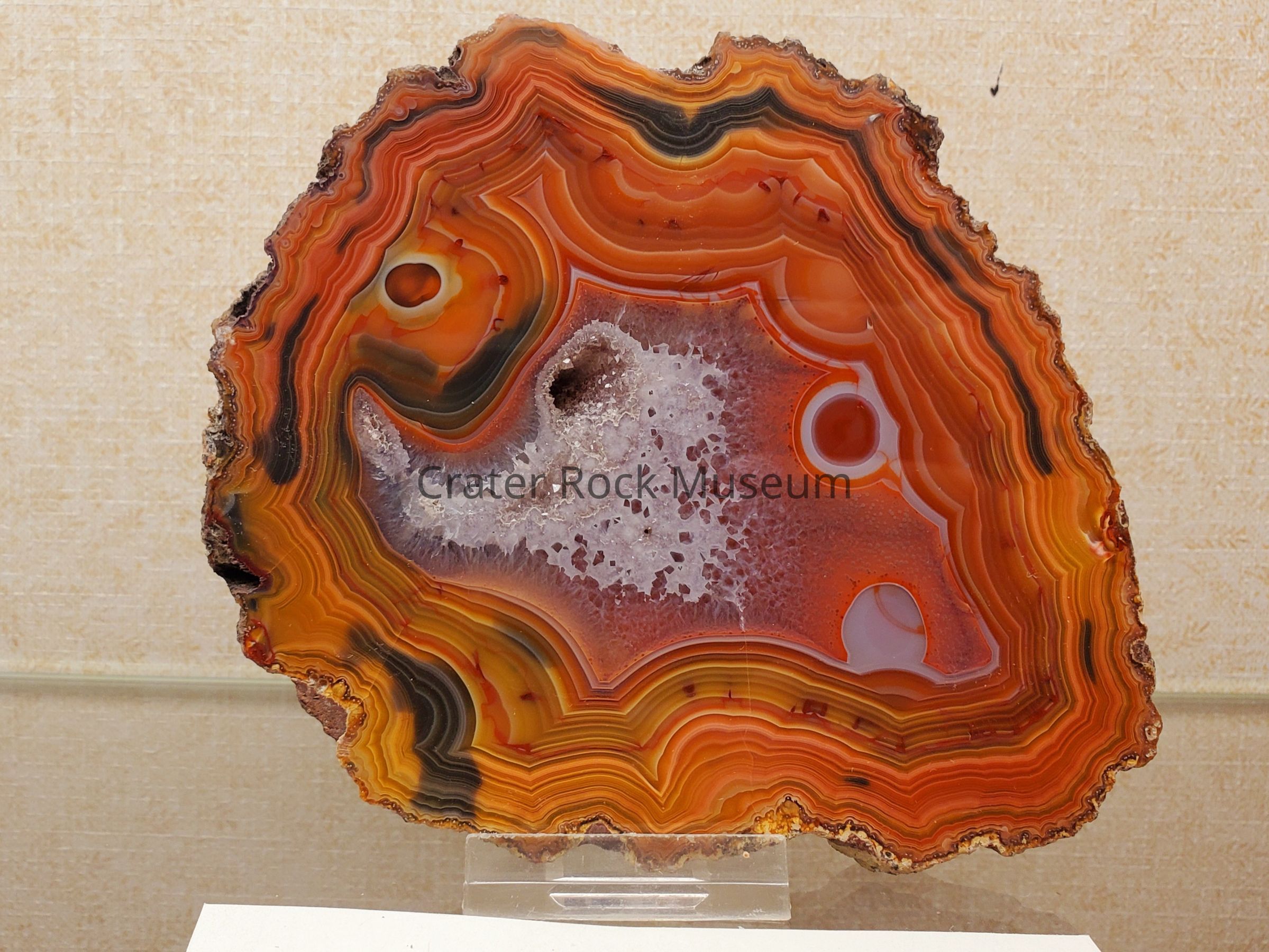 Description: Rough, rounded back with polished face. Highly banded in oranges, greens, reds and black with gray crystalline structure in center area.