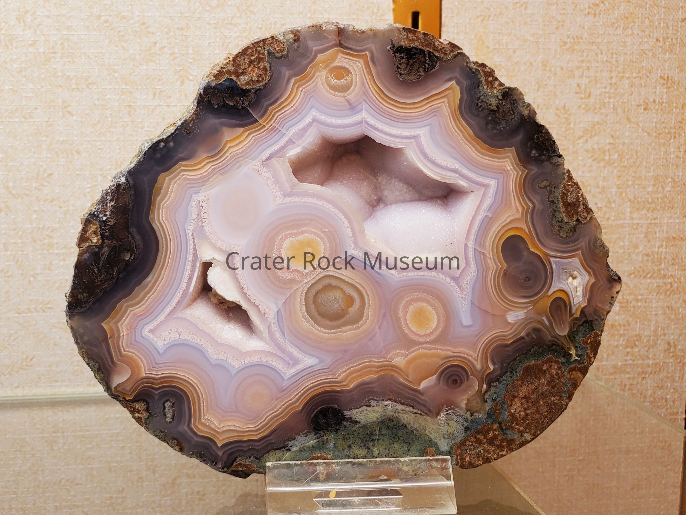 Description: Rough, rounded back with polished face. Outer area is translucent green, black, brown and smoky gray. Inner area is banded beige, lavender and white with multiple orbicular structures and a single druzy white cavity.