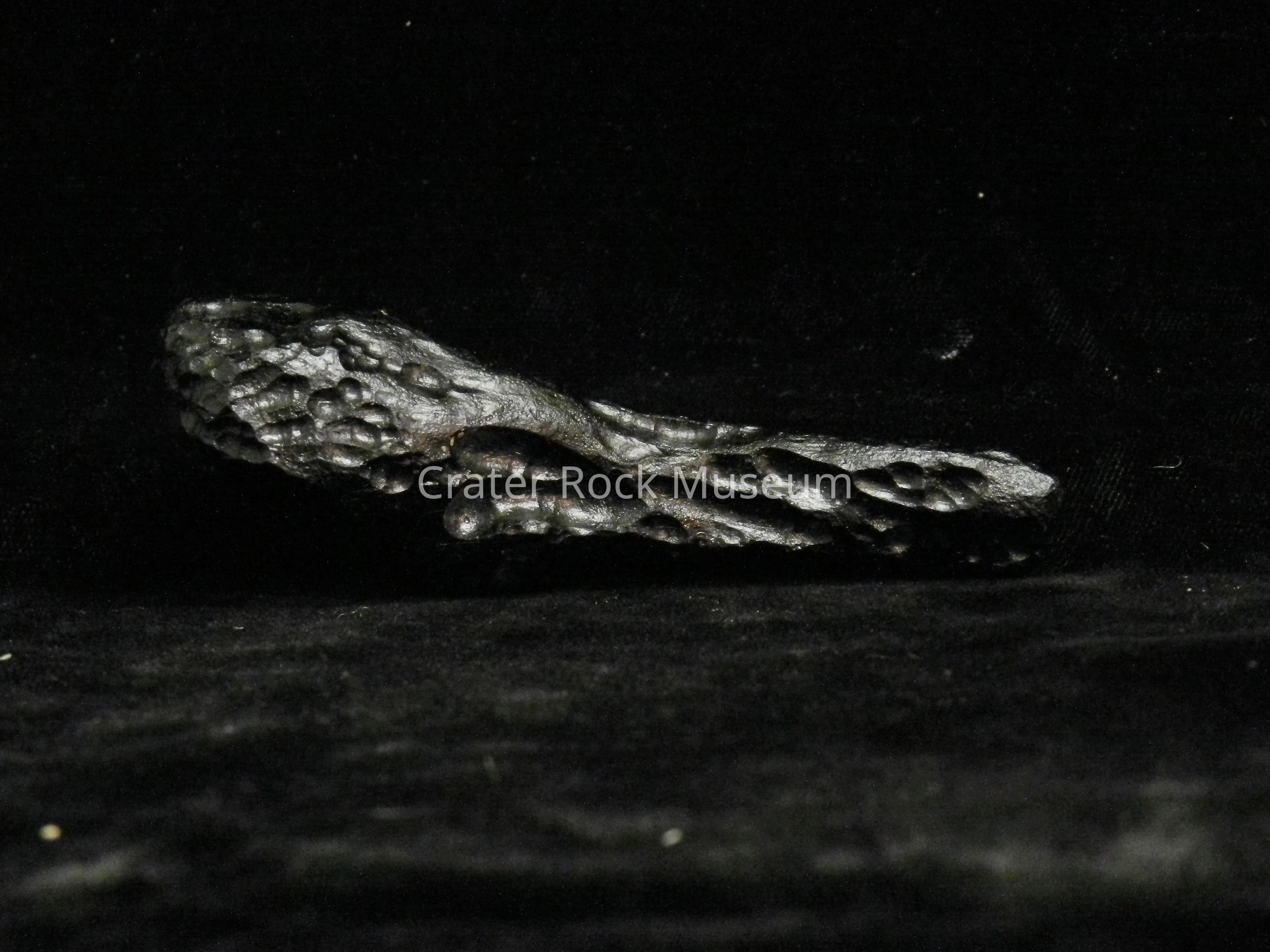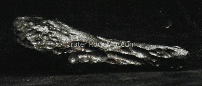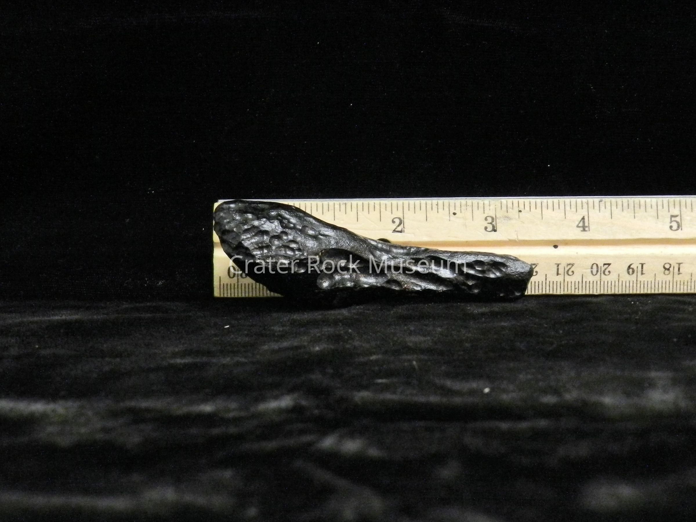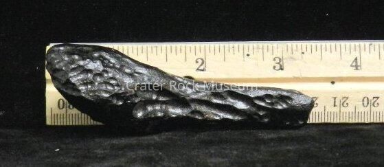 Description: Earth-rock 'splash' from meteorite strike. Cylindrical, elongated with bulbous structure on one end. Multiple pock marks throughout. Black in color.