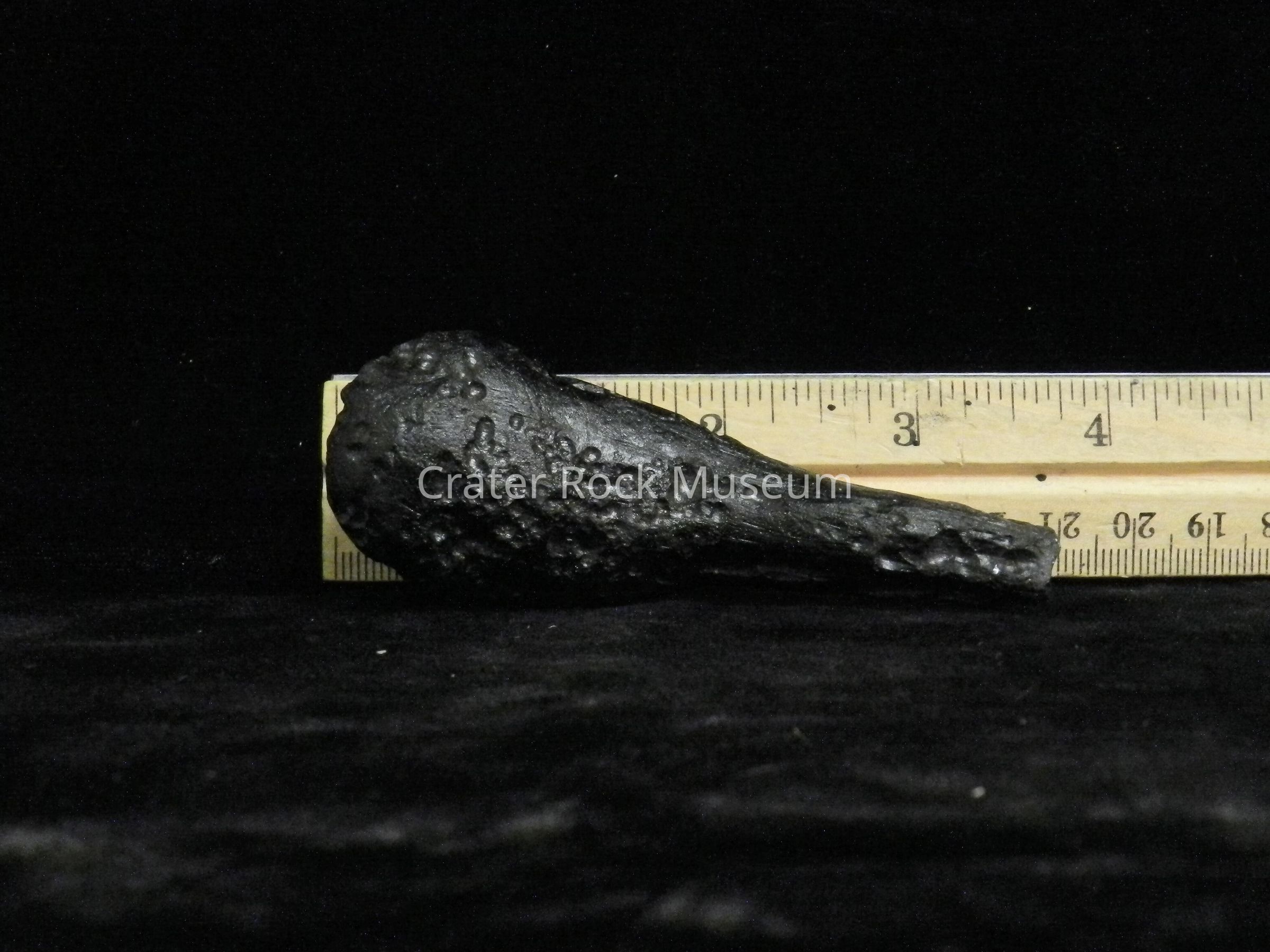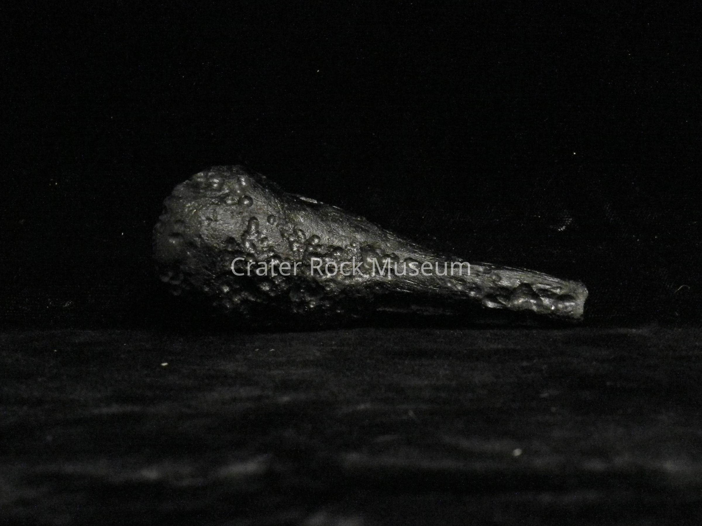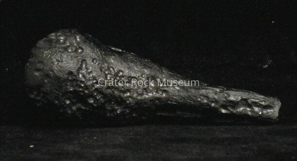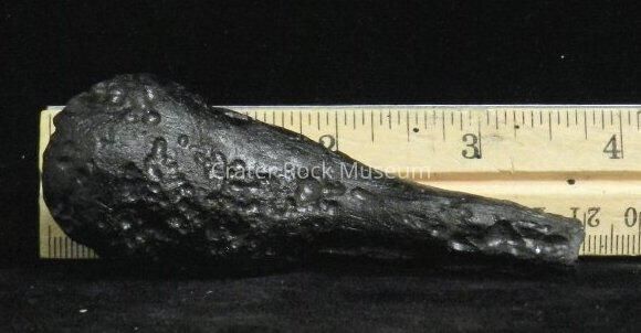 Description: Earth-rock 'splash' from meteorite strike. Cylindrical, elongated with a bulbous structure on one end. Multiple pock marks throughout. Black in color.