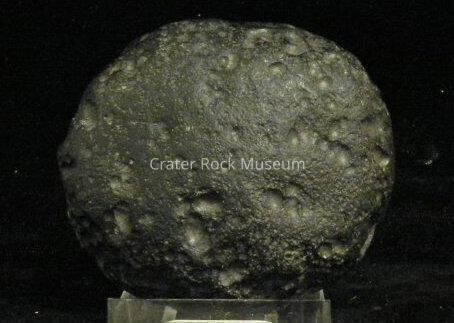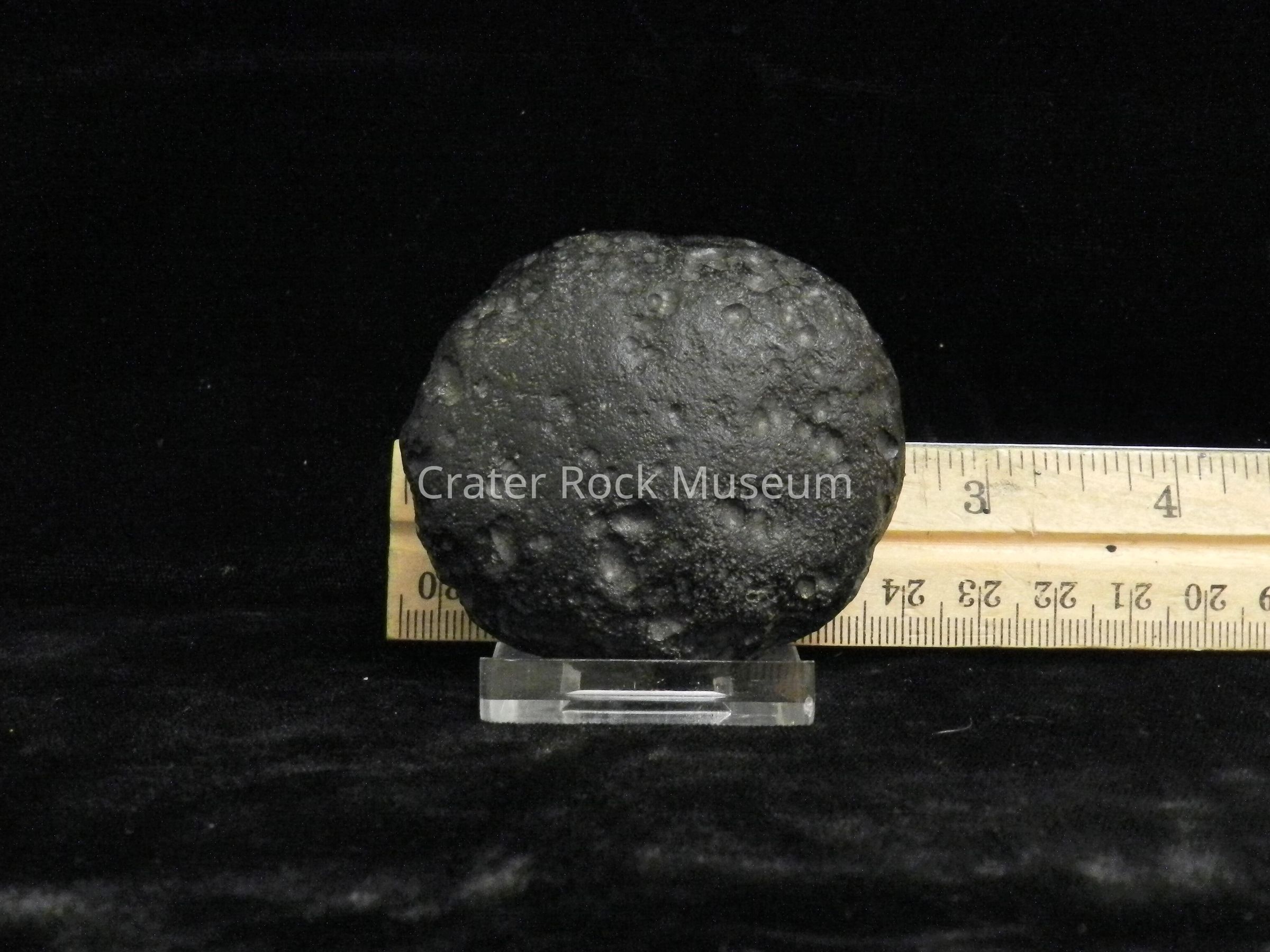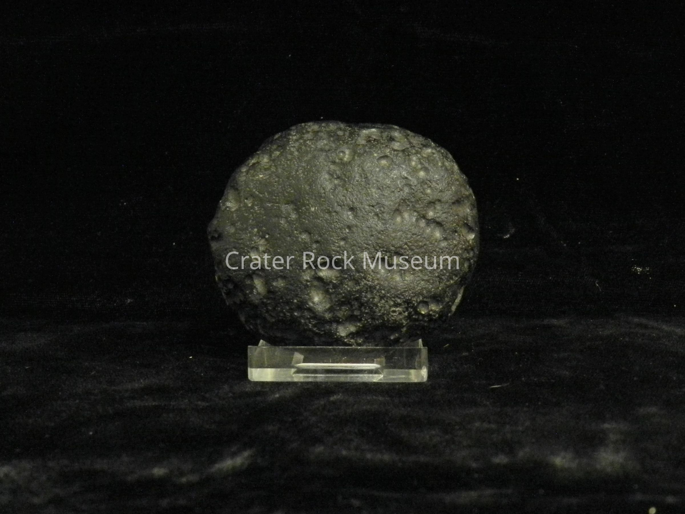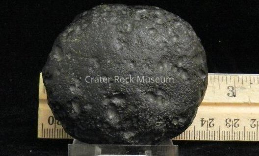 Description: Earth-rock 'splash' from meteorite strike. Circular with (2) convex faces. Multiple small pock marks throughout. Black in color.