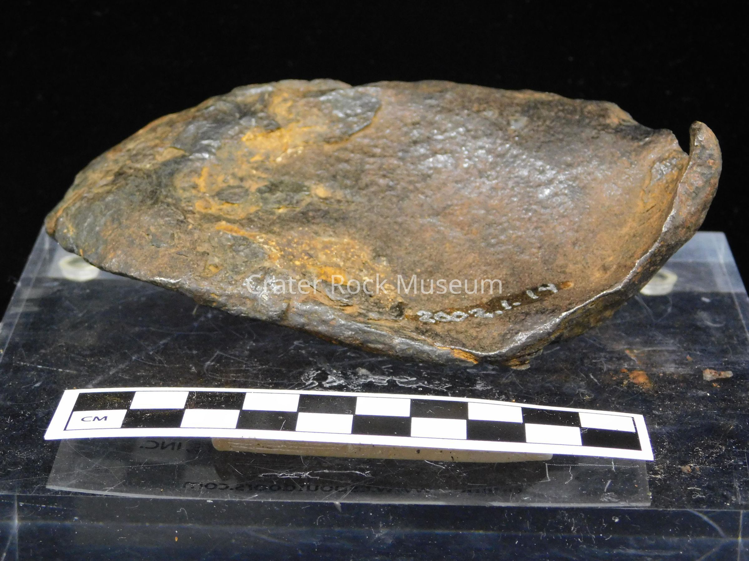 Description: Large, convex, angular and smooth metallic face with concave smooth back. One end is curled inwards. Color is dark brown with lighter spots of oxidation.
