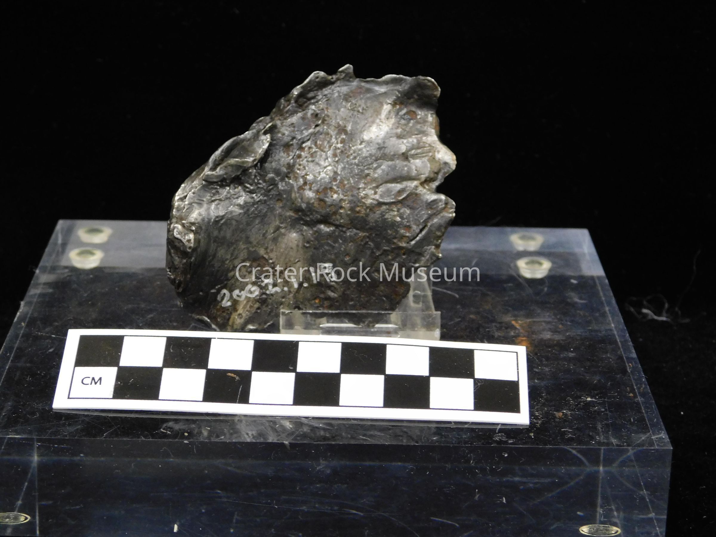 Description: Convex, metallic face with noticeable Widdmanstatten structure. Relatively smooth and rounded with folded corners around some edges. Silver-black to gray. Specimen has had major rust removal done in the past.