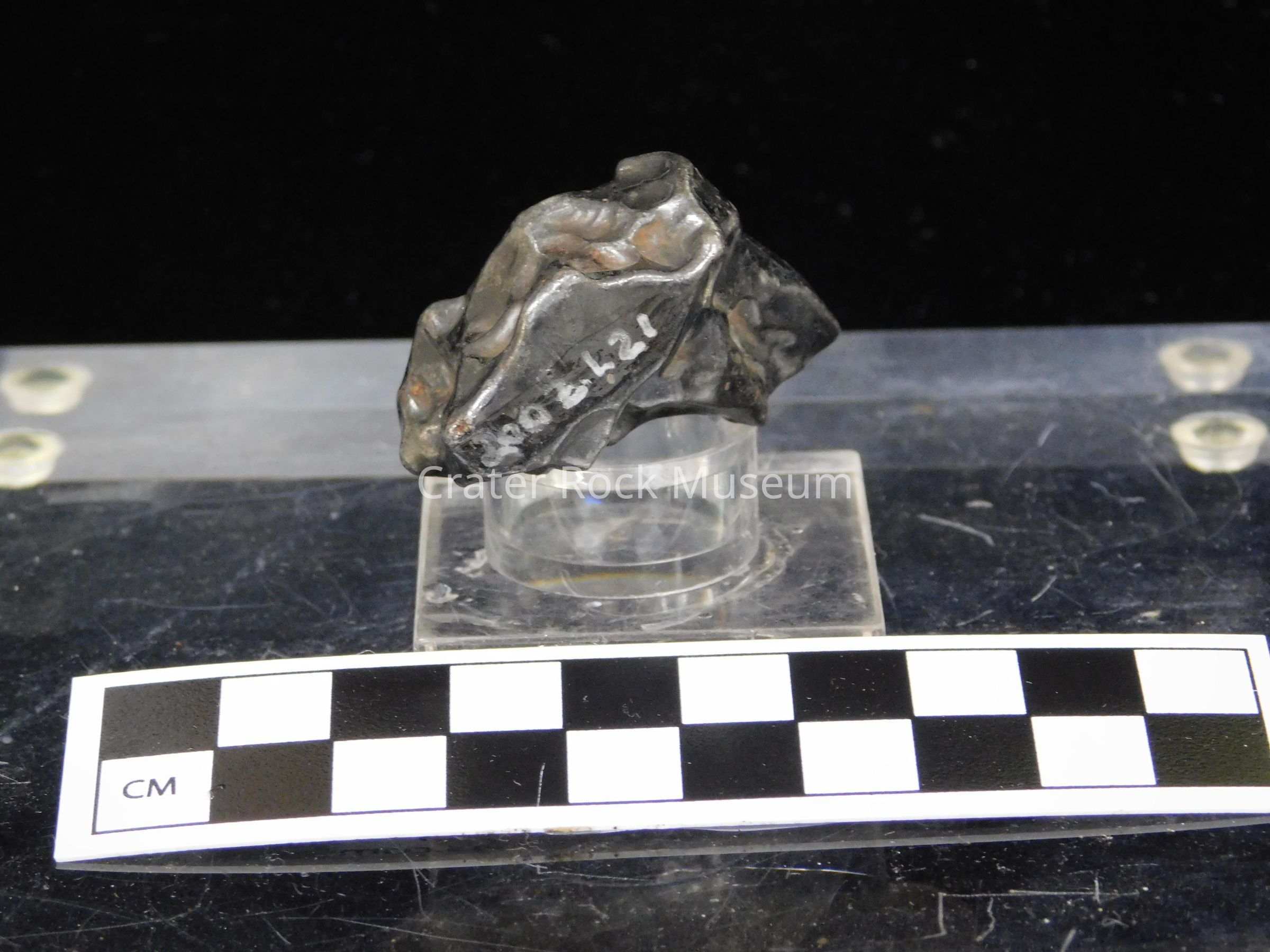Description: Small, metallic, highly thumb-printed throughout with a jagged irregular face and a large thumb-print cavity on the back in center. Silver-black to gray in color.