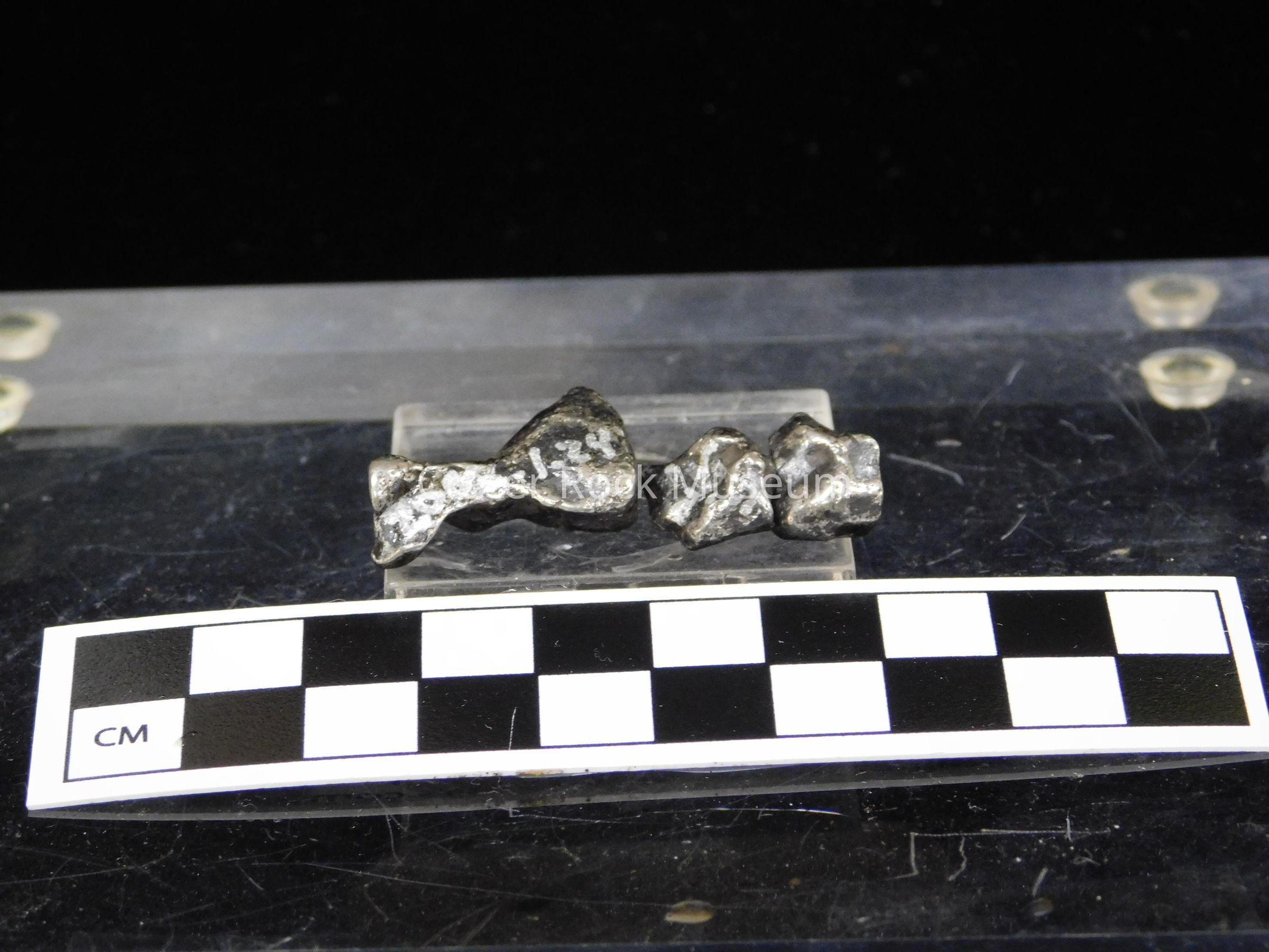 Description: Very small metallic, highly thumb-printed with smoooth surface areas. Silver-black to gray in color.