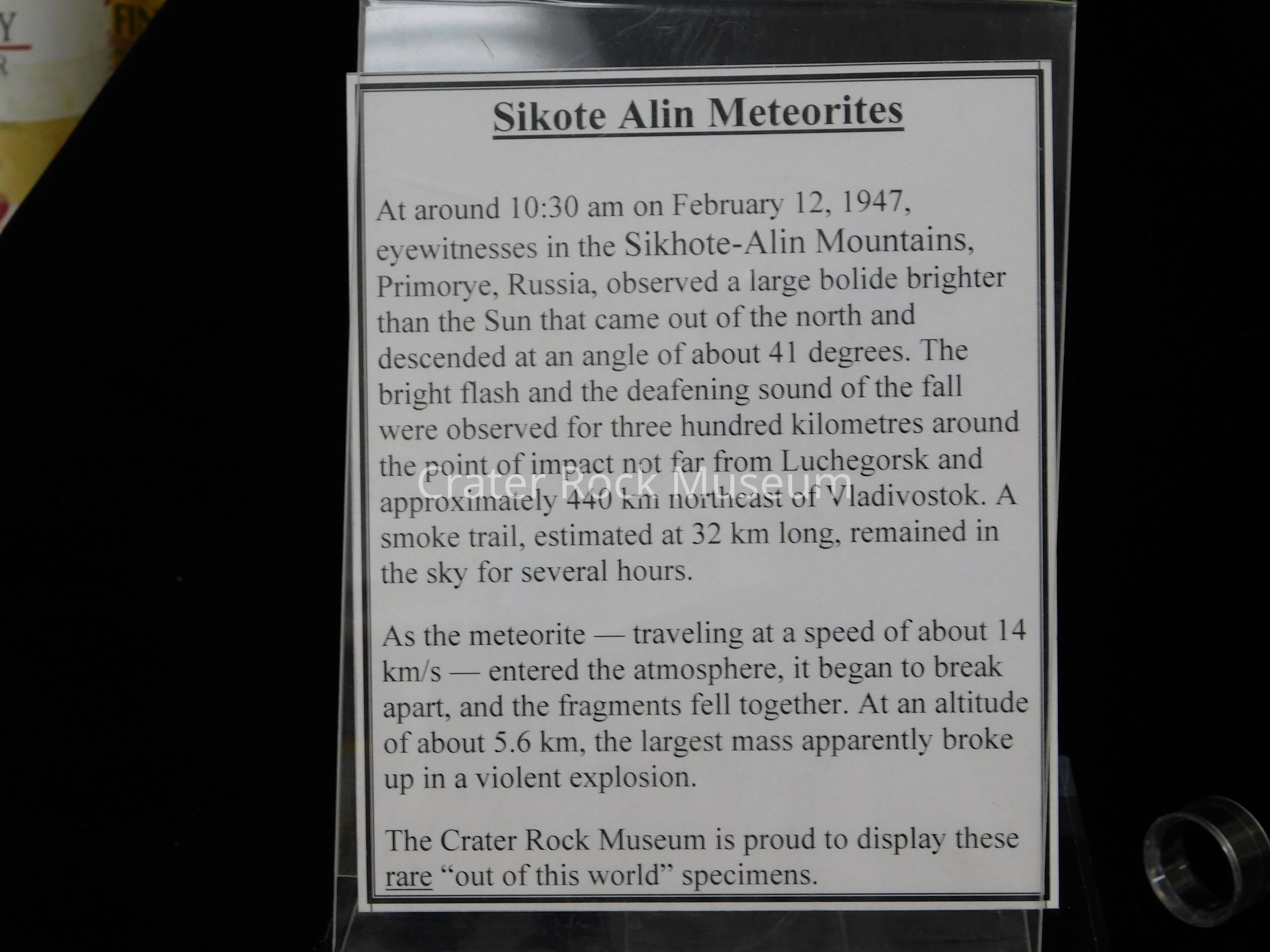 Variety: Sikhote-Alin is an iron meteorite that fell in 1947 on the Sikhote-Alin Mountains in eastern Siberia. This fall is unique in the history of meteorites. Though large iron meteorite falls had been witnessed previously and fragments recovered, never before in recorded history had a fall of this magnitude been observed. An estimated 70 tonnes of material survived the fiery passage through the atmosphere and reached the Earth.Collection