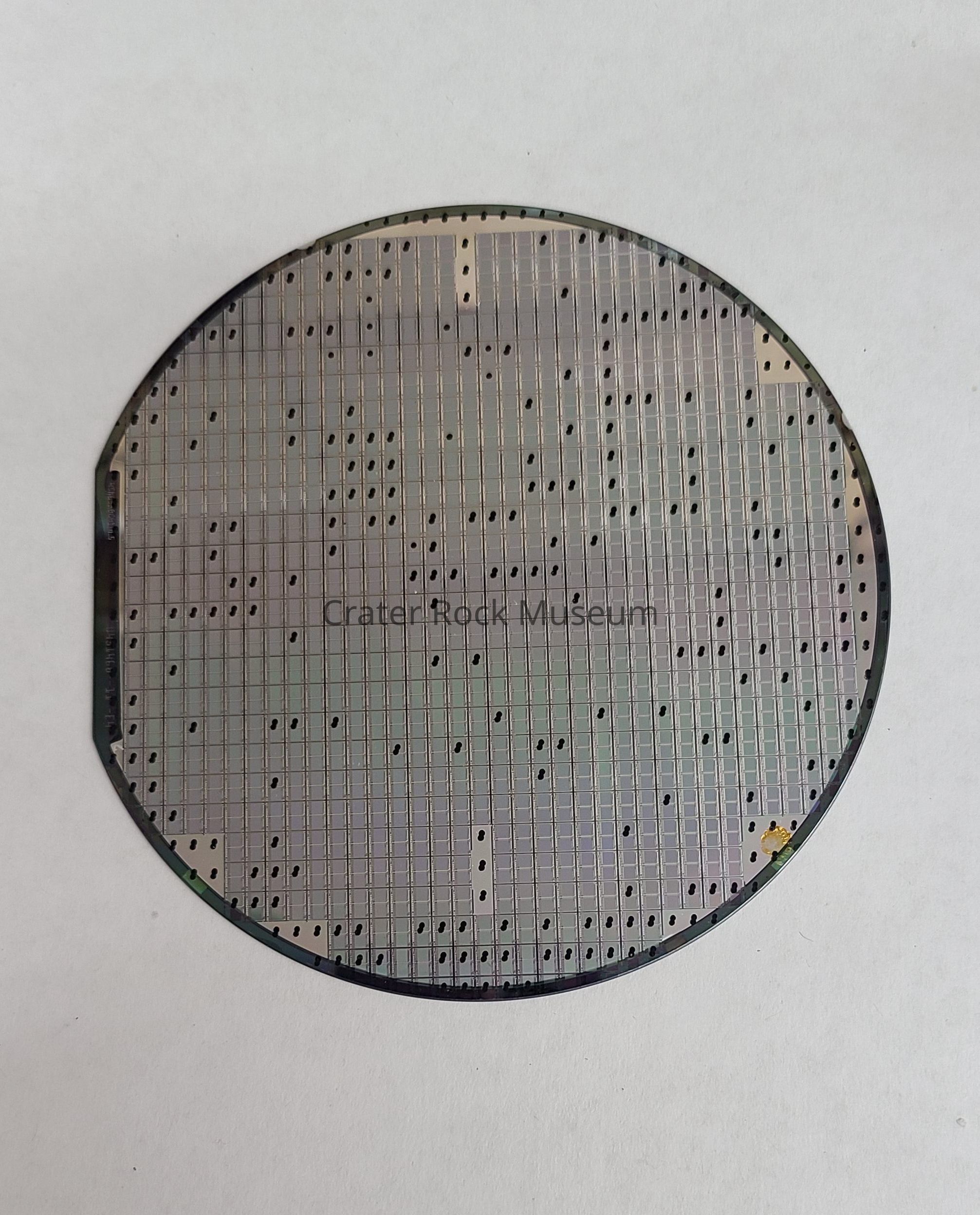 Description: Circular silicon wafer (microprocessor) with etched circuitry. Black outer band with silver-gray inner area with multiple black spots.
