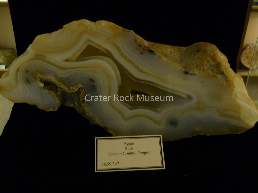 Delmar: "Cut side shows an open hole in the center in fortified agate in clear to whites to grays to cream. Piece resembles a fish with 'eye' and 'mouth', with a curled tail. Piece is unpolished and contains a few cracks."Collection