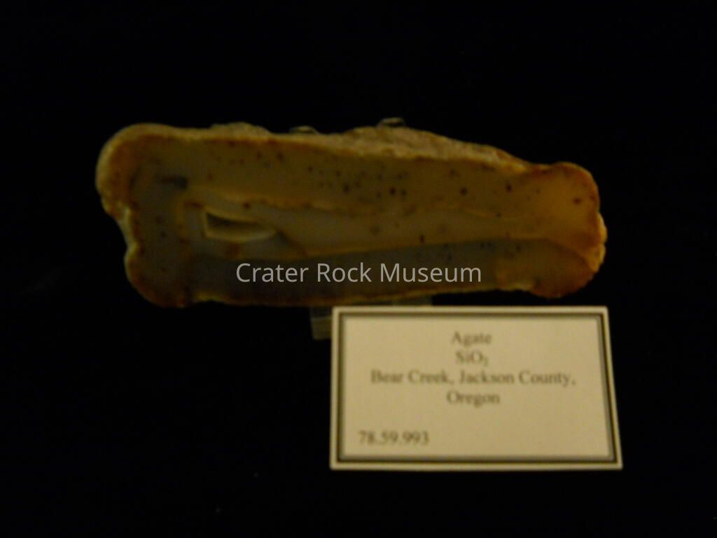 Delmar: "Thick slice of dendritic agate. Polished side shows pinkish gray agate with brown dendritic spots. Open fine crystalline hole seen. Some orange along outer edges."Collection