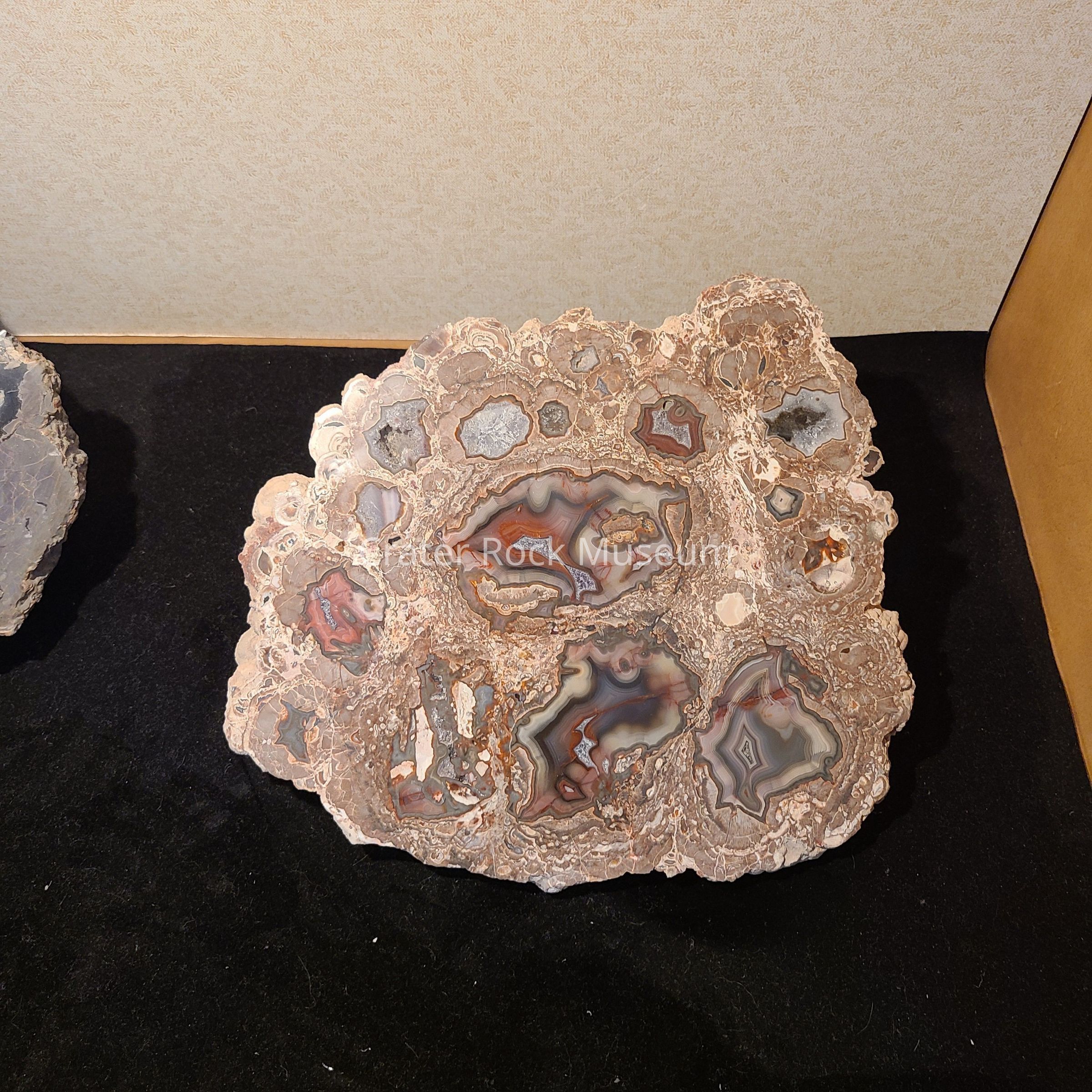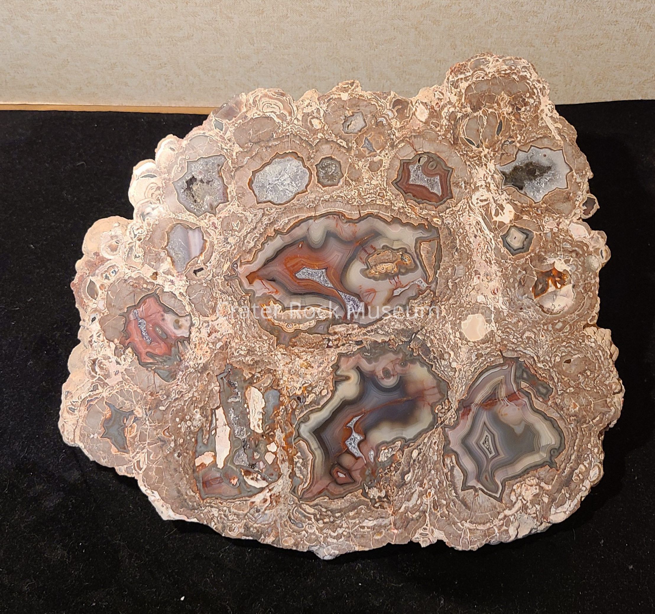 One very unusual Thunderegg, multiple conglomerate. Slab cut showing. Apx 16 - 18 Thundereggs that were joined together to form one large multiple by the action of boiling lava. Each Thunderegg varies in size from tiny to 3 1/2" in Diameter. All within the same matrix. Found at the Baker Ranch near Columbus, NM. Colors: Grey-Browns, Grey-Blues, White Crystals and Red.Dimensions