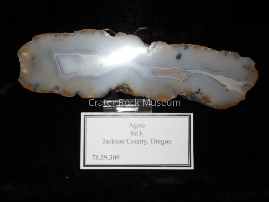 Delmar: "An elongated agate nodule. Polished side shows fortified agate in cream, whites, and grays, some brown, and a few black dendrites. Center of fortified area is a small crystalline hole in cream area. Central zone is divided into three areas."