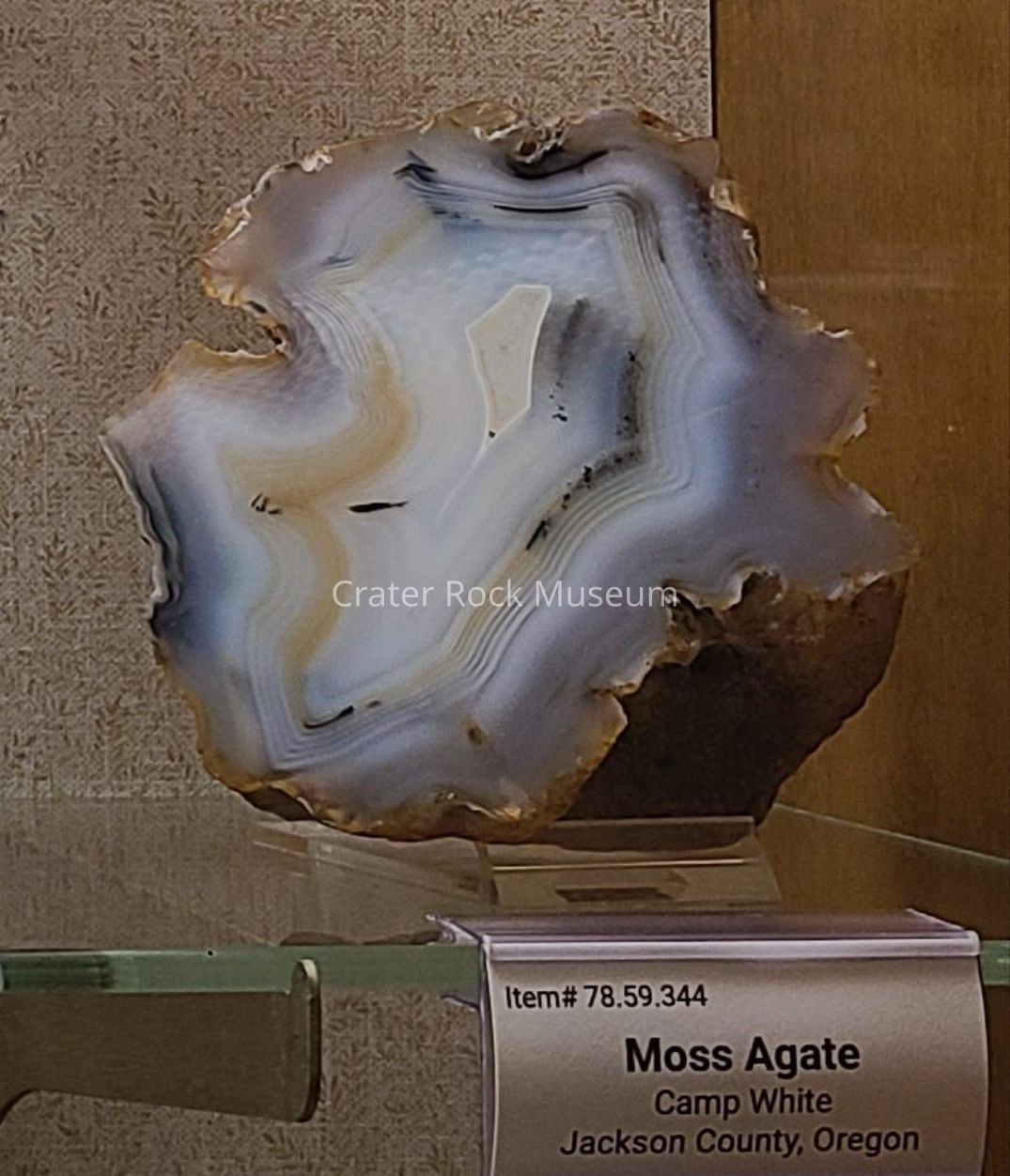 Delmar: "Agate. Cut side shows distinct fortified agate in white, grays, and mustard around a crystalline center. Black dendrite is obvious. Fortification lines midway between center and edge are very distinct."Collection