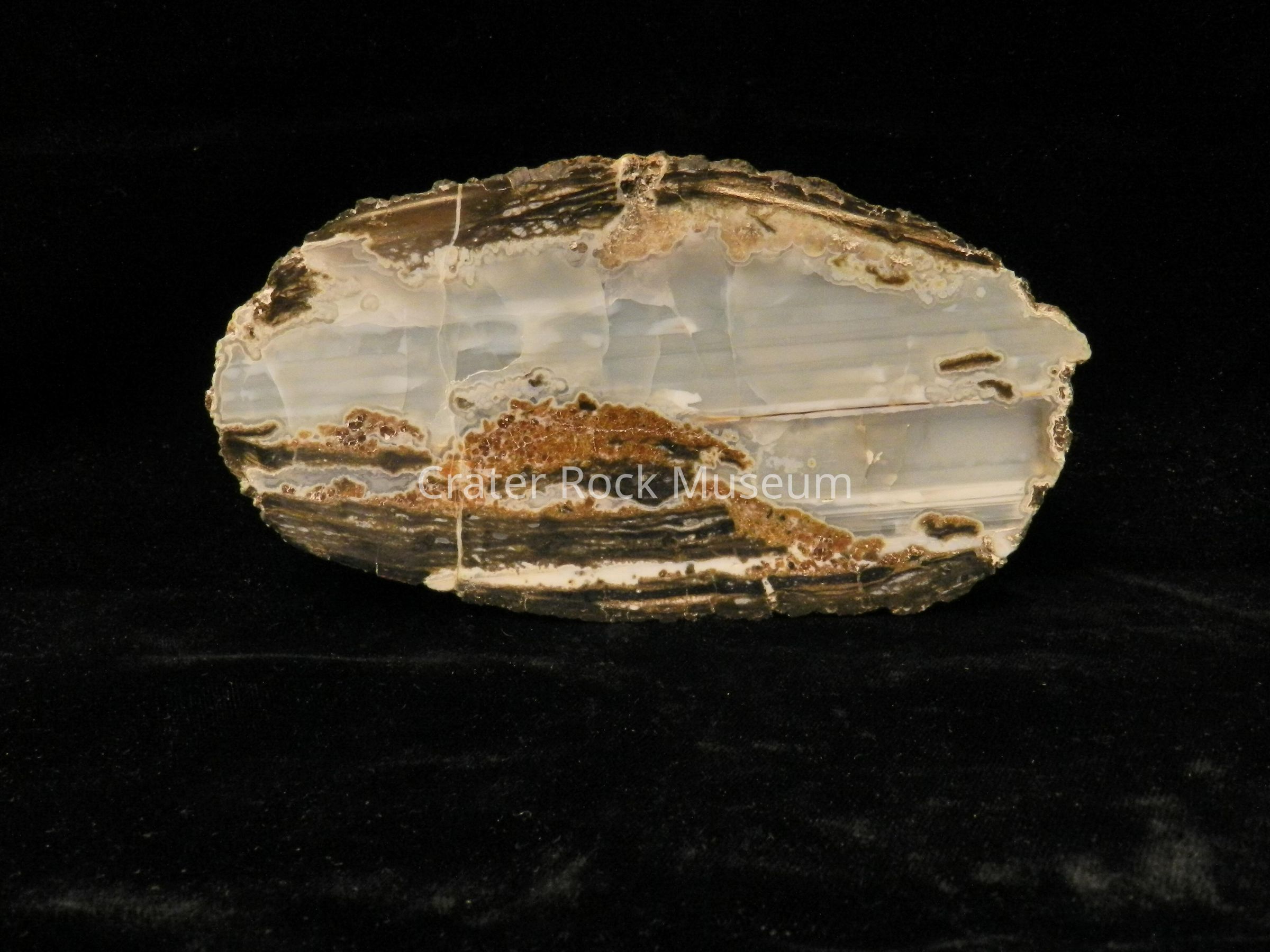 Description: (Delmar) Thunderegg. Polished side shows unusual central agate formation in elongated bedded agate in light grays and whites. Surrounding rock is in 'bumpy' browns, orange browns, and blacks. Some surface cracks seen.Collection