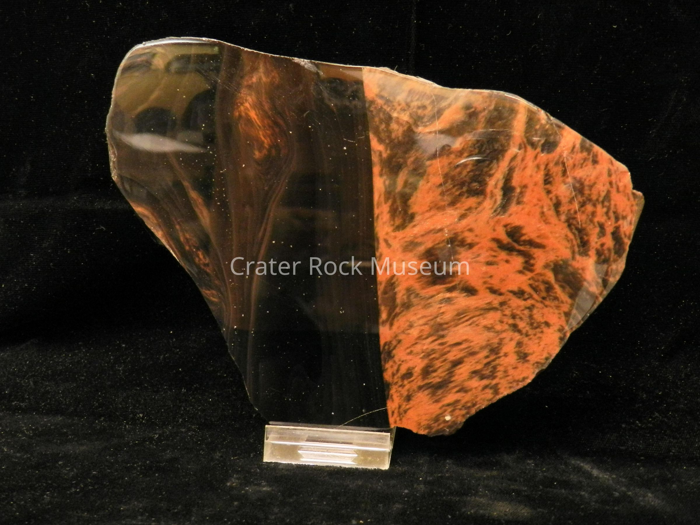 Description: (Delmar) Obsidian [volcanic glass] from a double flow. Polished side shows clear division between halves; one in black with some swirled orange and 'floating' white specks, the other in swirled orange with some black and a sheen resembling Tigereye.Collection