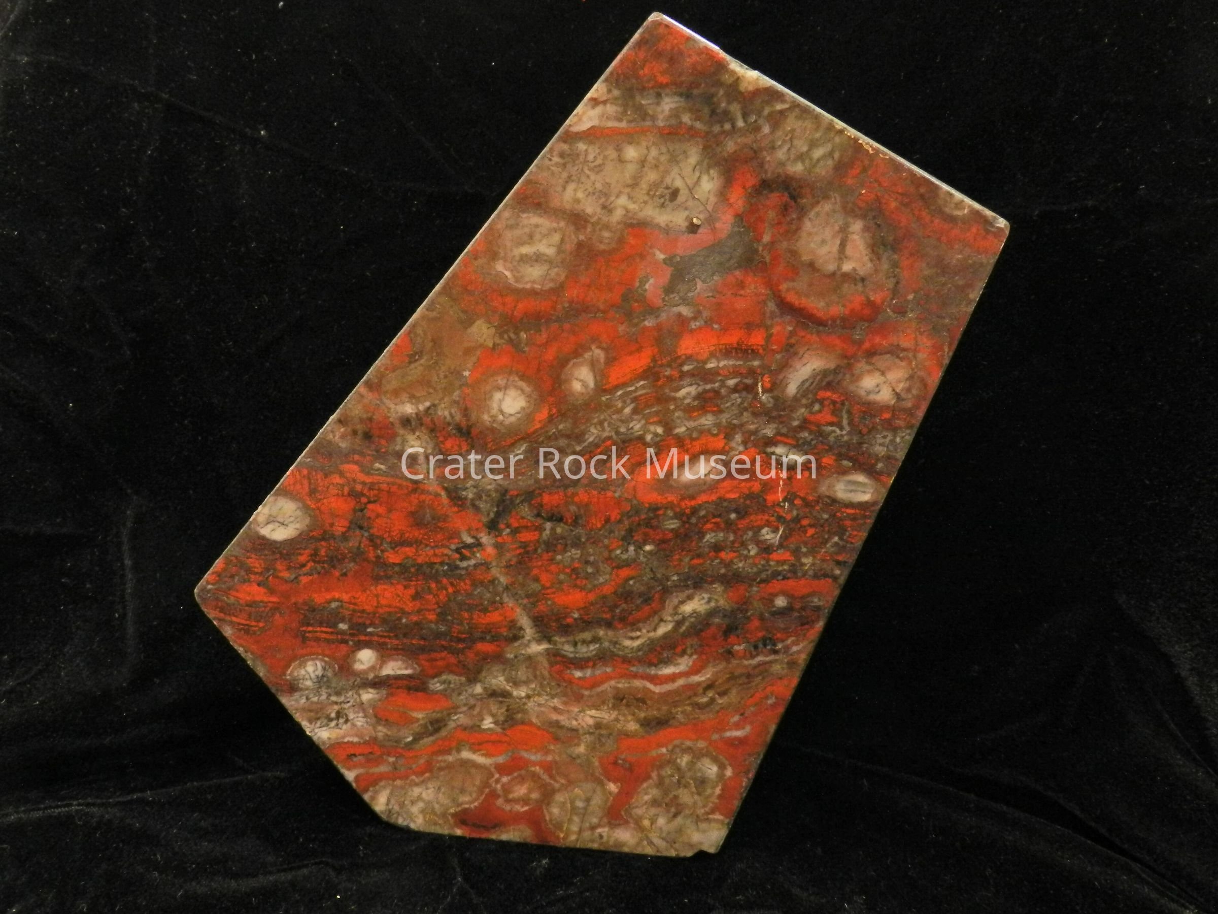 Description: (Delmar) Poppy Jasper. A large, broken block of stone from a house built in 1880 in Yreka, made of poppy jasper from the Yreka area. This piece was the keystone to the fireplace. Colors: Brick red with 'eyes' and swirls in grays and black. Block is in an oblong, five-sided shape.Collection