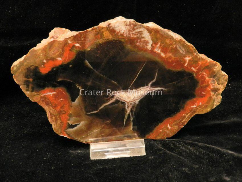 Description: Doug Foster describes this specimen as being a butt cut slab from a round trunk. Tan and brown-reddish tan on the outside and on the bark side. Black, tan, cream and reddish-tan on the inside.