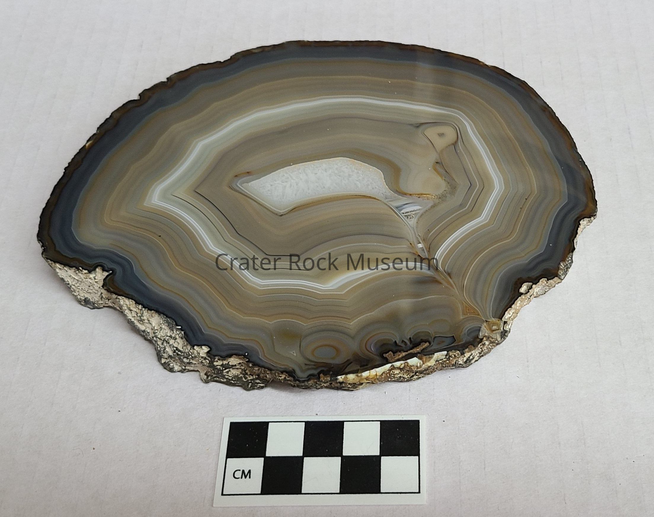 A 5/8" (1.6 cm) thick slice of an Agate Nodule from Brazil. Infiltration hole is present in one corner extending to the center which is filled with Quartz. Fortification bands of various shades of Blue (darkest at outside) Grey, Browns and Tans and three White ones found midway between center and edge. Three eye patterns at one side and one Cream colored eye in another corner.Dimensions