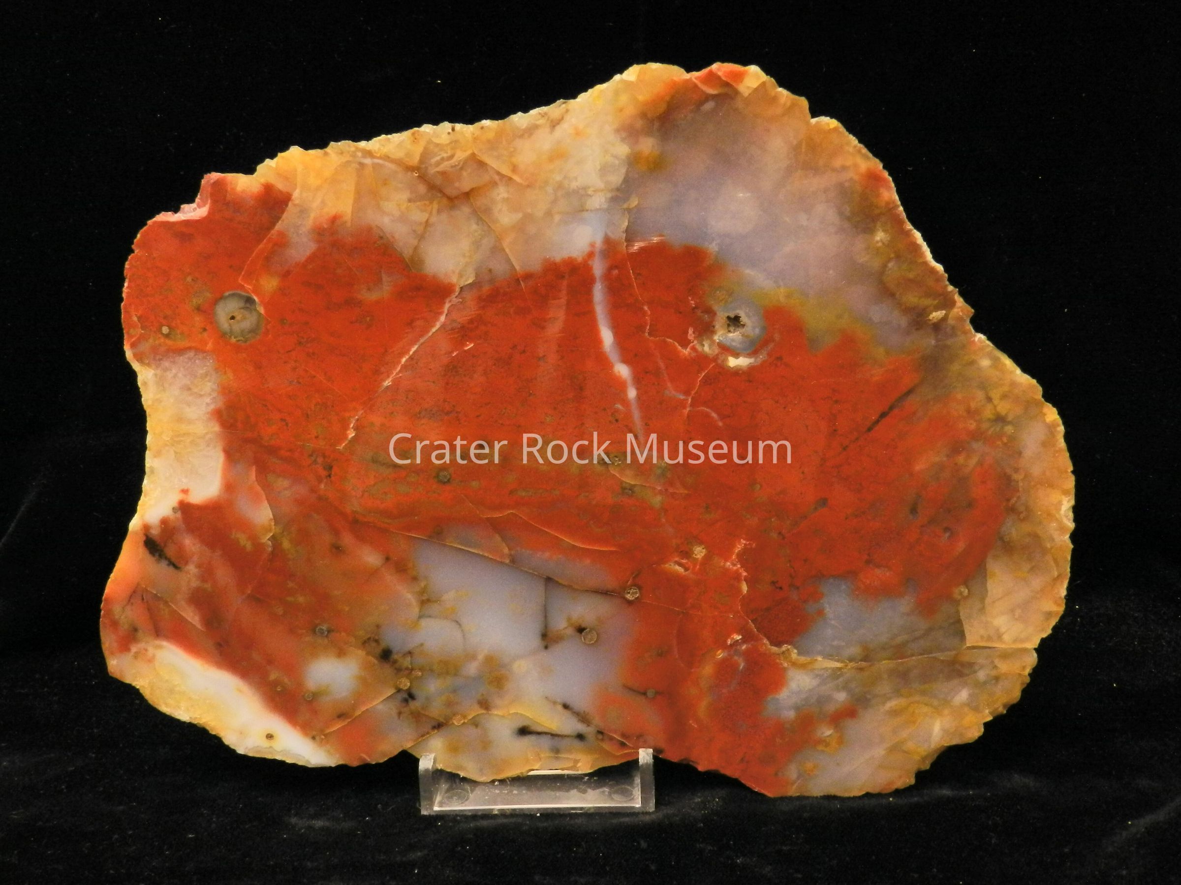 Description: Agate. Polished side shows deep red-orange in irregular patterns towards center, with milky-white surround. Tan-brown edges.Collection