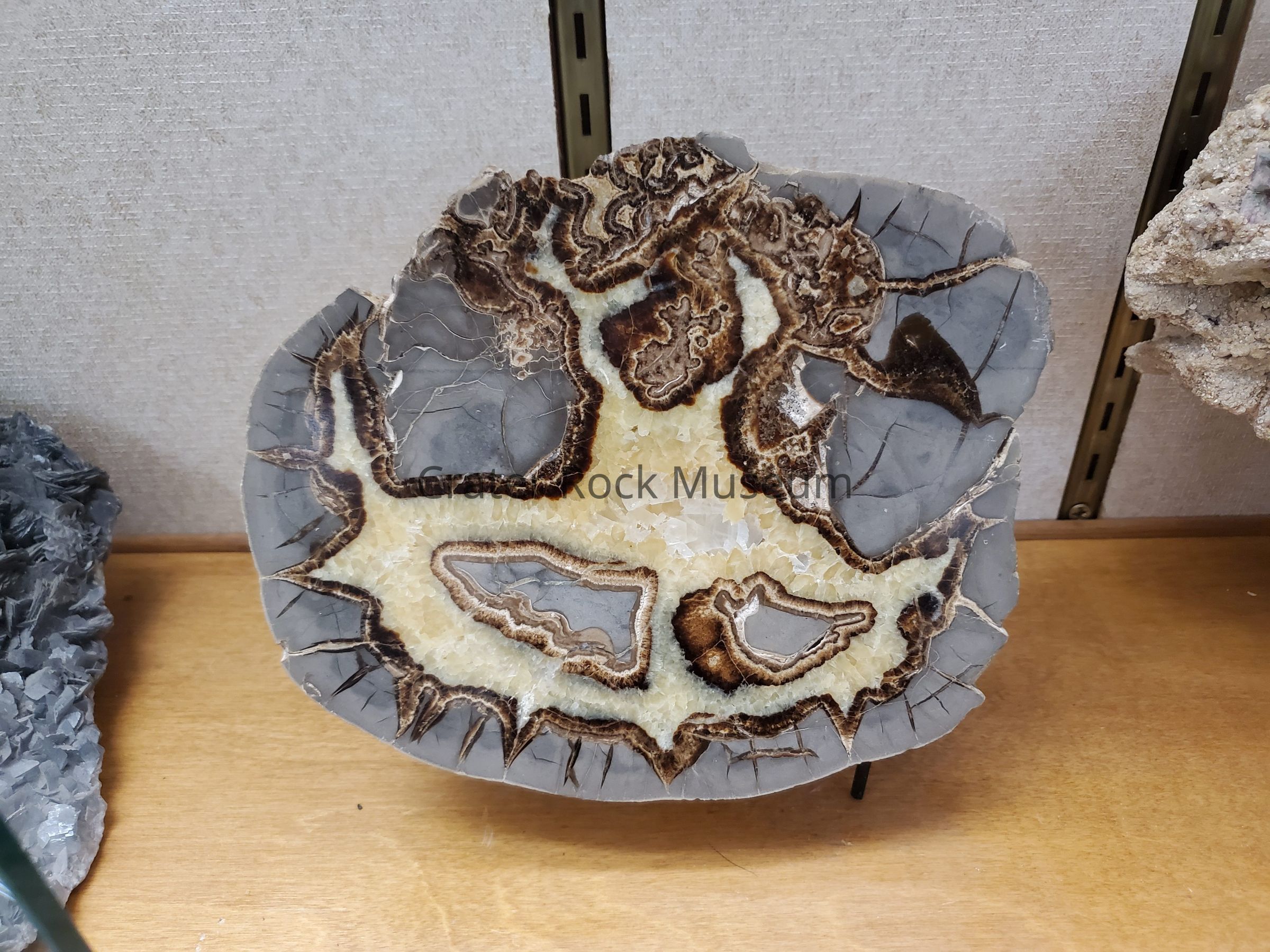 Description: (Delmar) Septarian Nodule. Piece formed at the bottom of the sea, like a mudball. Cut side shows fine-grained gray matrix rock with yellow and brown mineral filler. Two gray areas of rock in yellow zone. The exterior is beiged colored with a very smooth surface (water worn). Backside shows area that could be fossil remains.