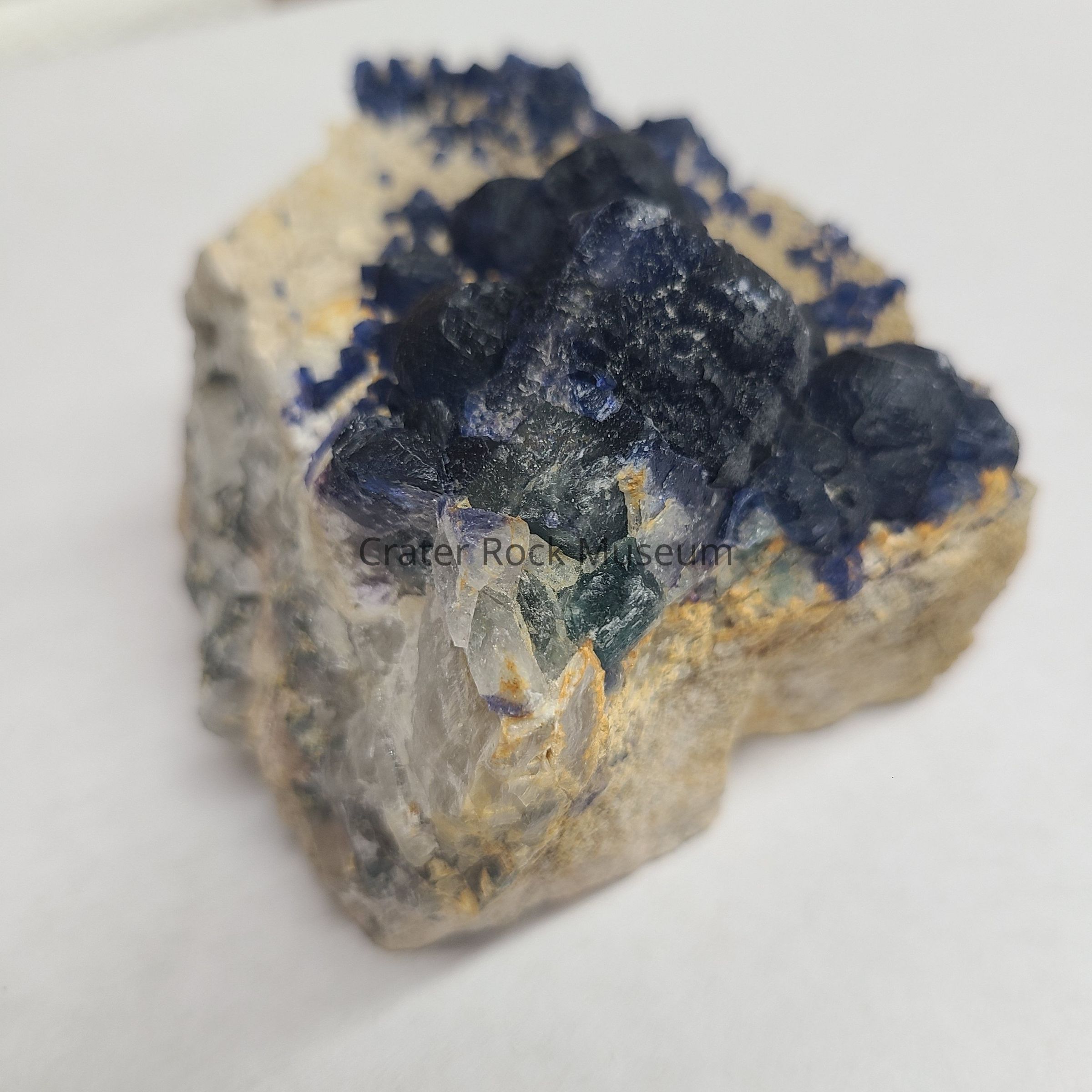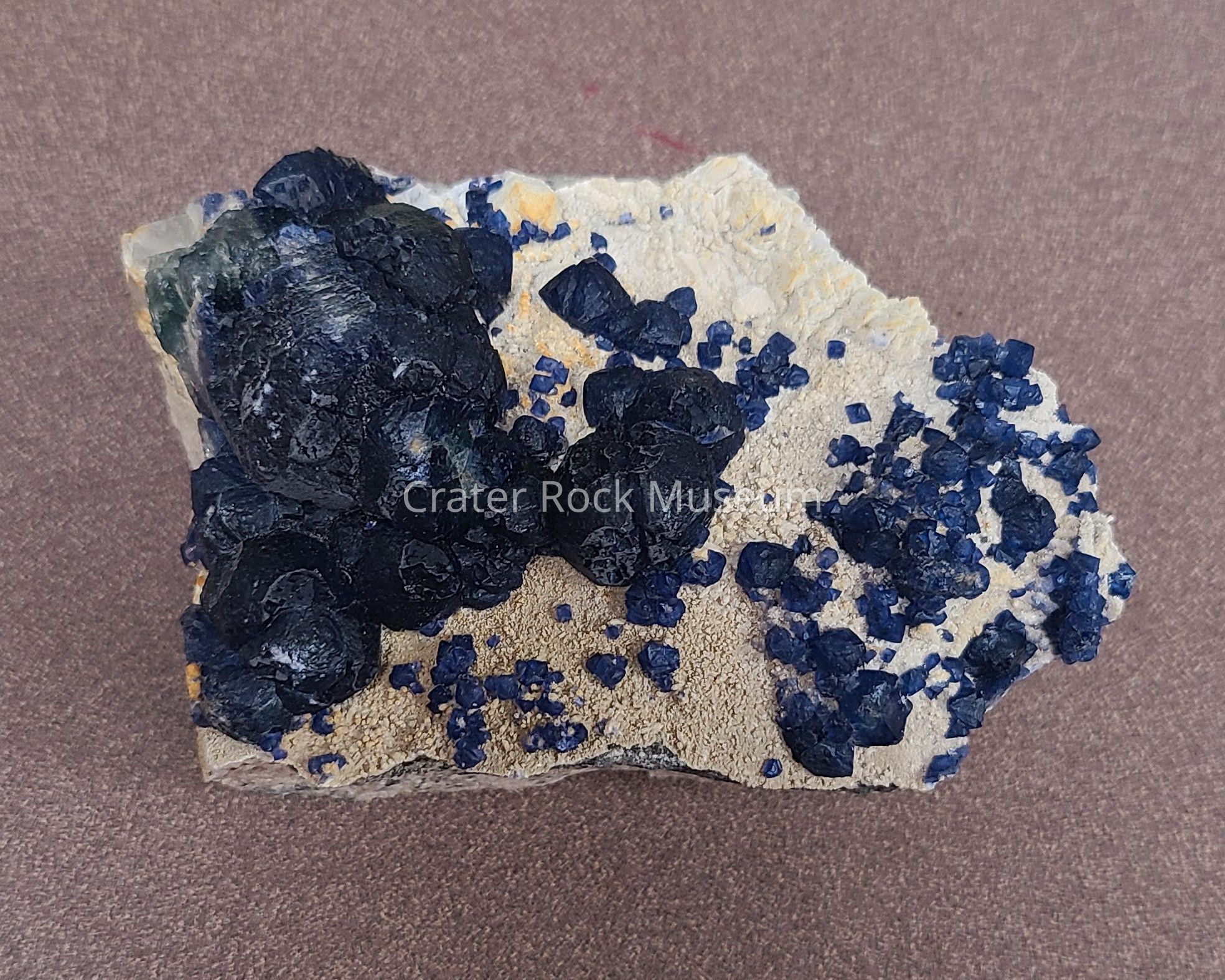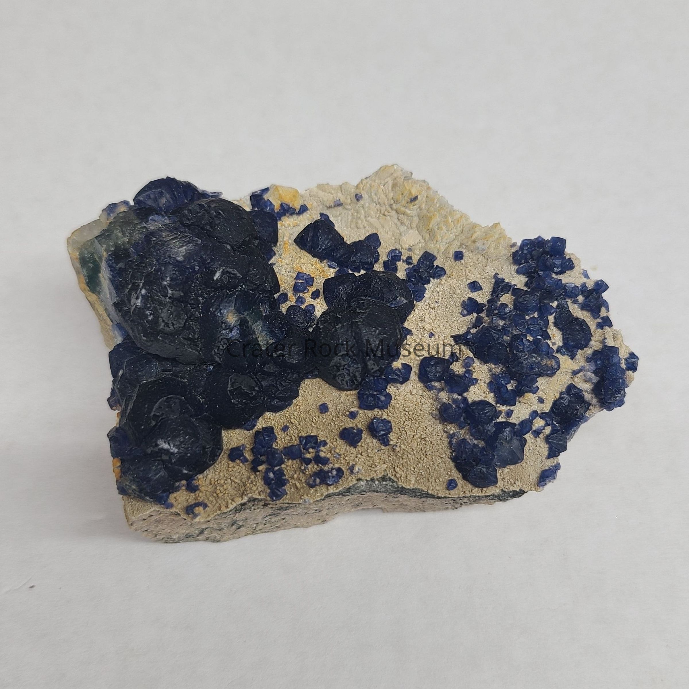 Deep blue fluorite nodules atop a patchy light beige matrix. Some green blue lighter crystals beneath the largest node and quartz on one side.Location