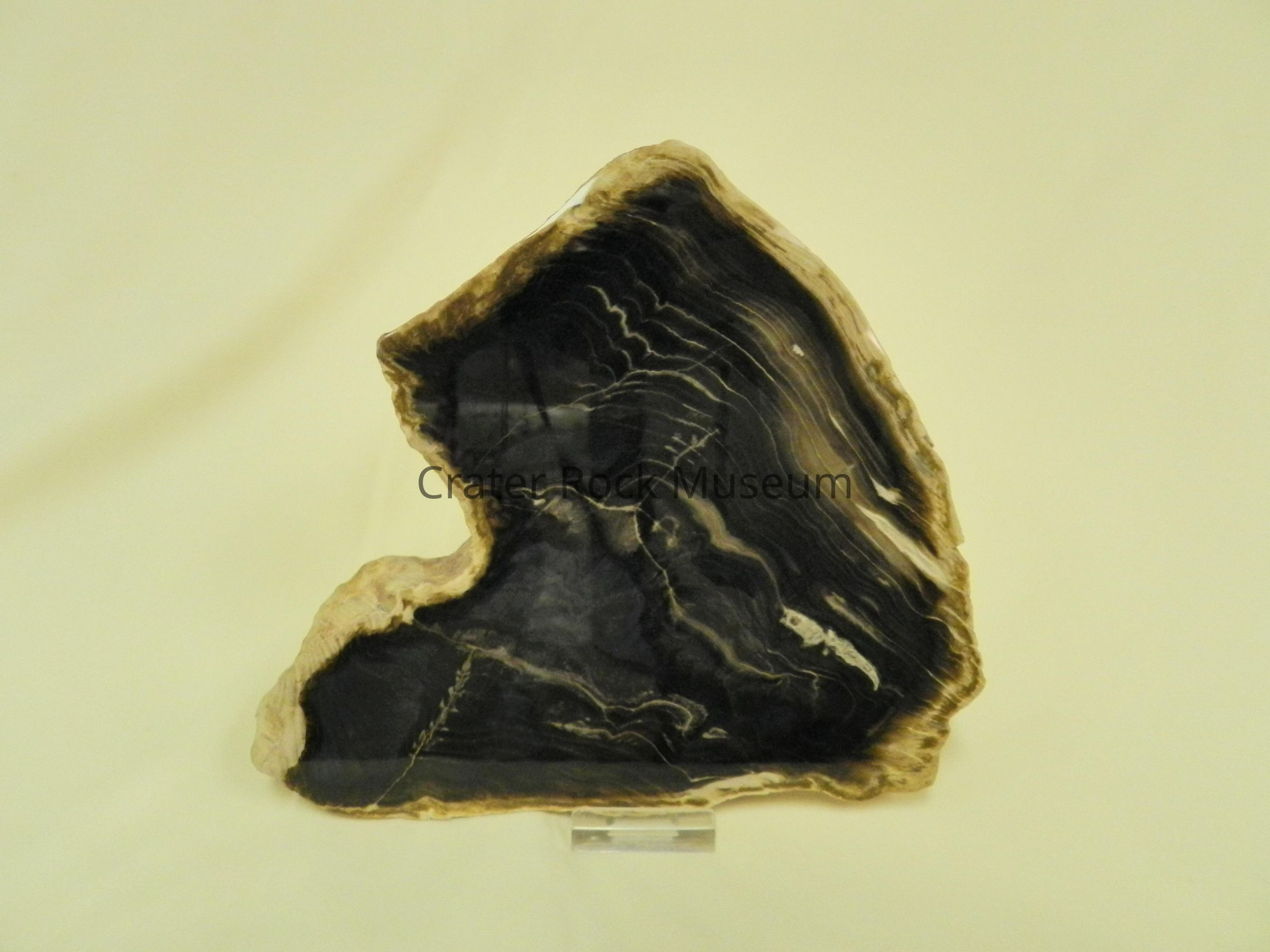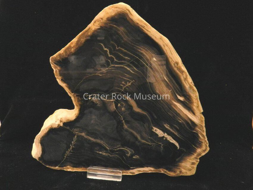 Description: (Delmar) Petrified wood. Shape resembles a horse's head. Polished side shows dark brown and black wood (unusual for Sweethome wood), with cream-colored wood at edge. Several surface cracks seen. Piece is cut with the grain.