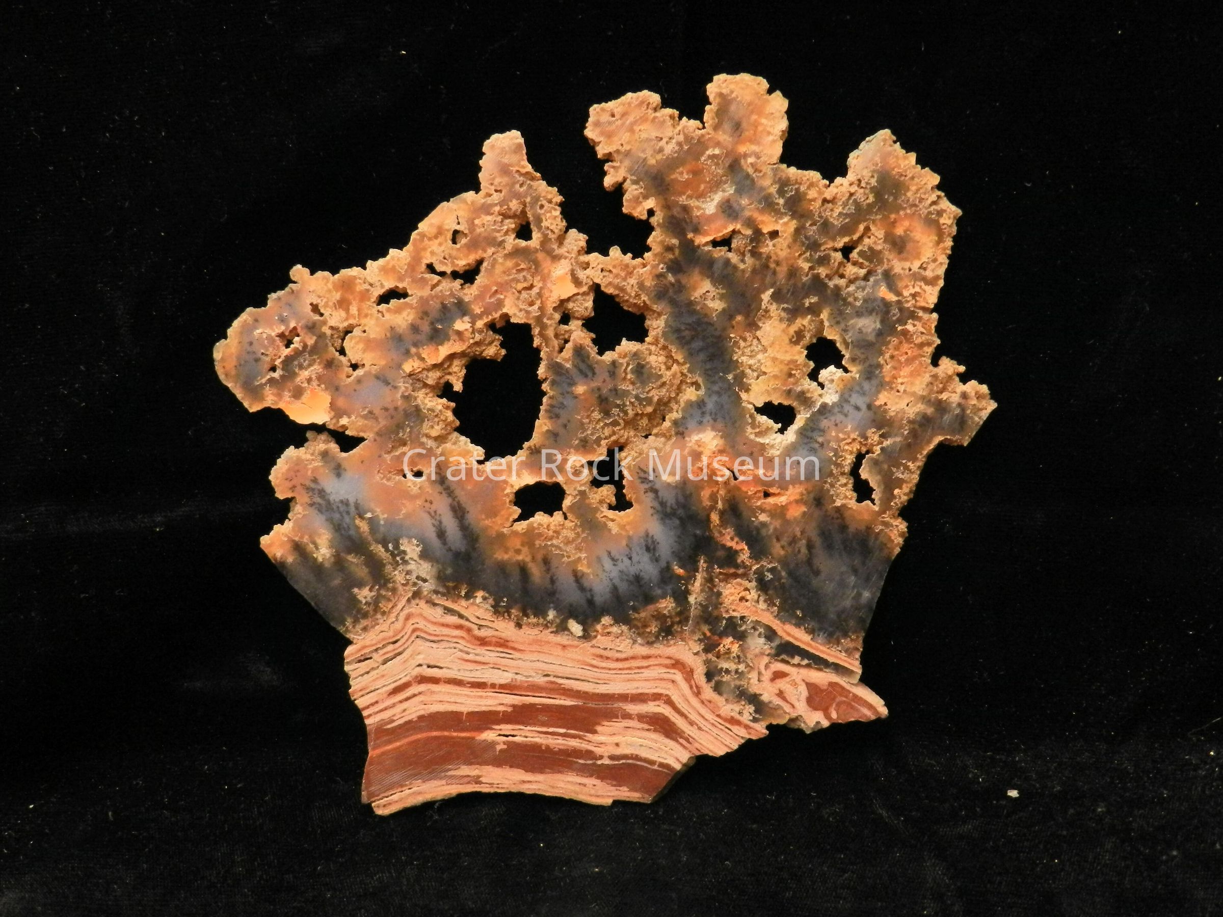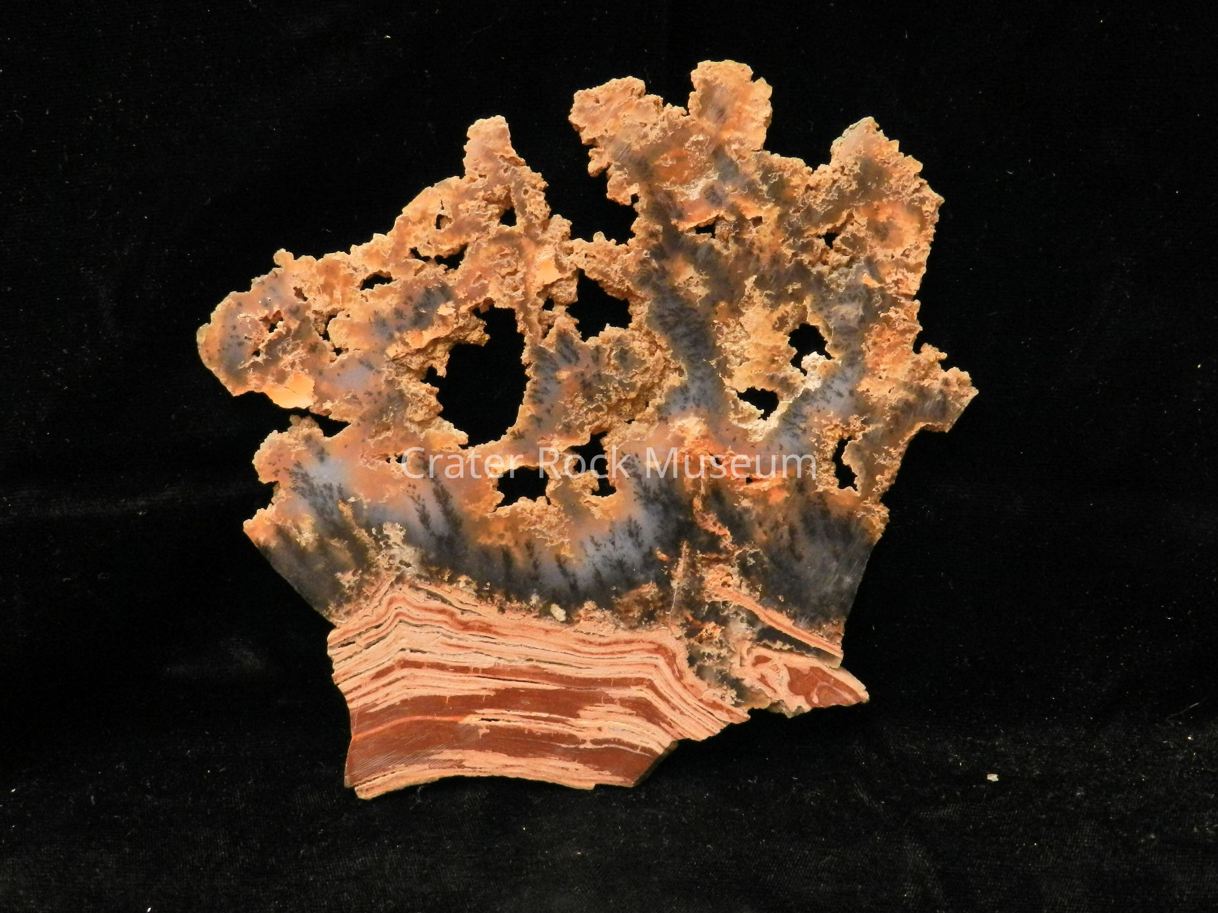 Description: (Delmar) Dendritic Agate. Polished on both sides. Colors: Pink and gray agate with black dendrite. One side of piece has a striped pink and red opaque rock. Piece contains multiple holes, giving it a 'lacy' appearance.Collection