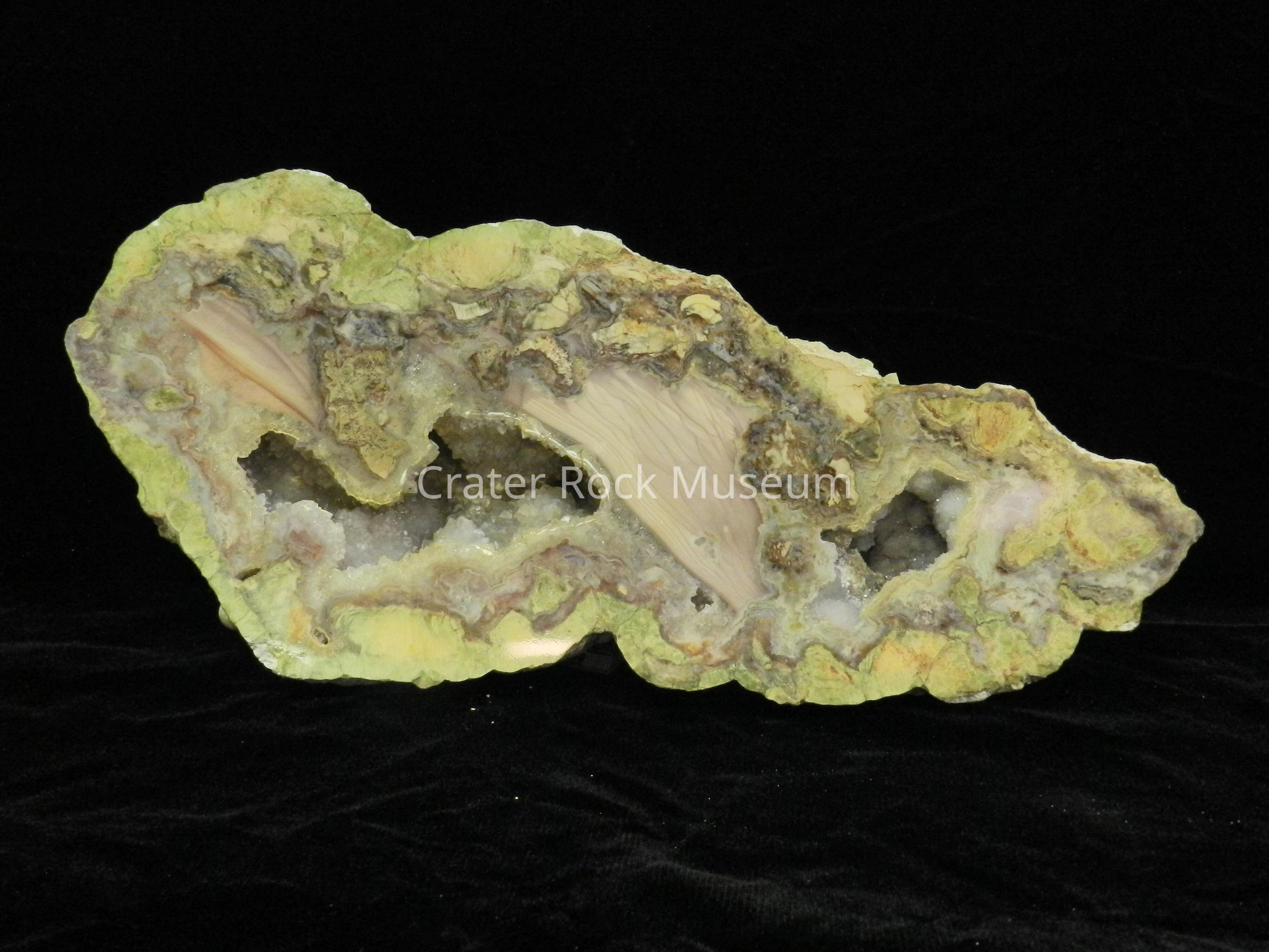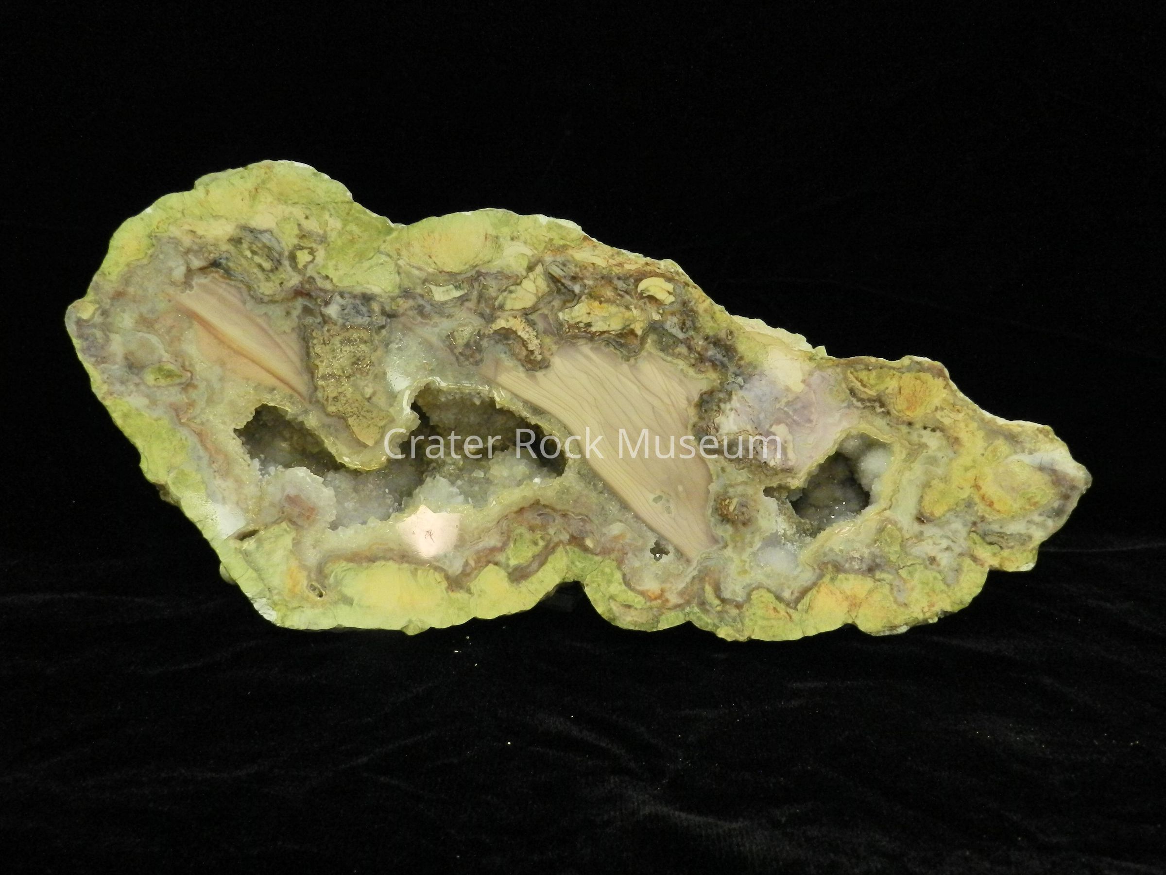 Description: (Delmar) An elongated, multiple-chambered thunderegg. Cut side shows open crystalline areas (in pale gray), surrounded by swirled agate in gray and red, some black with two opaque striped agate areas in cream and lavender. Surrounding rock is in yellow and bright greens, some orange.Collection