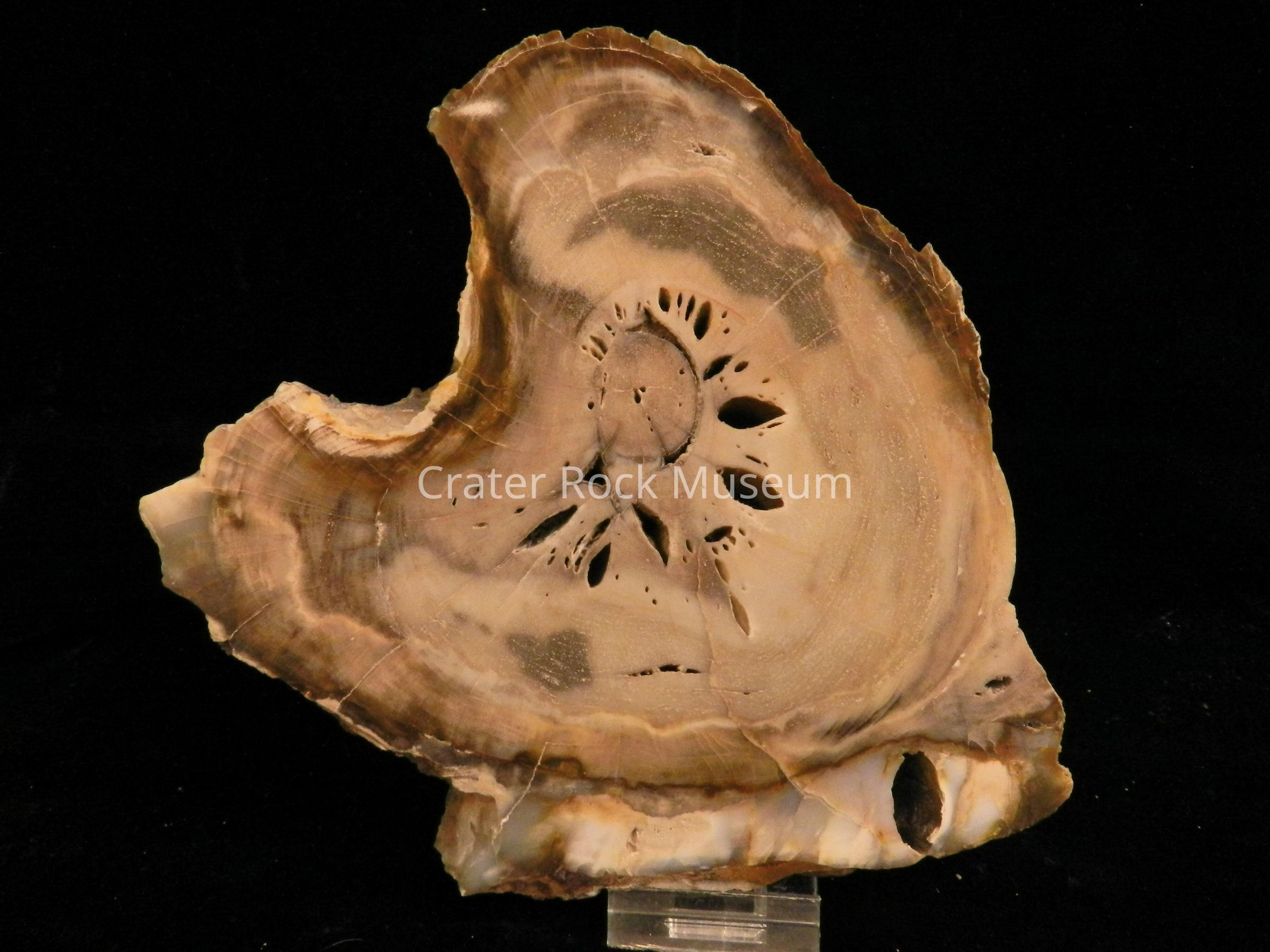 Description: Doug Foster describes this specimen as being a butt cut slab from a round trunk. Tan outside. Tan, brown, and orange-brown form distinct rings. Oval-shaped holes in center, formed when bald cyprus dries out.